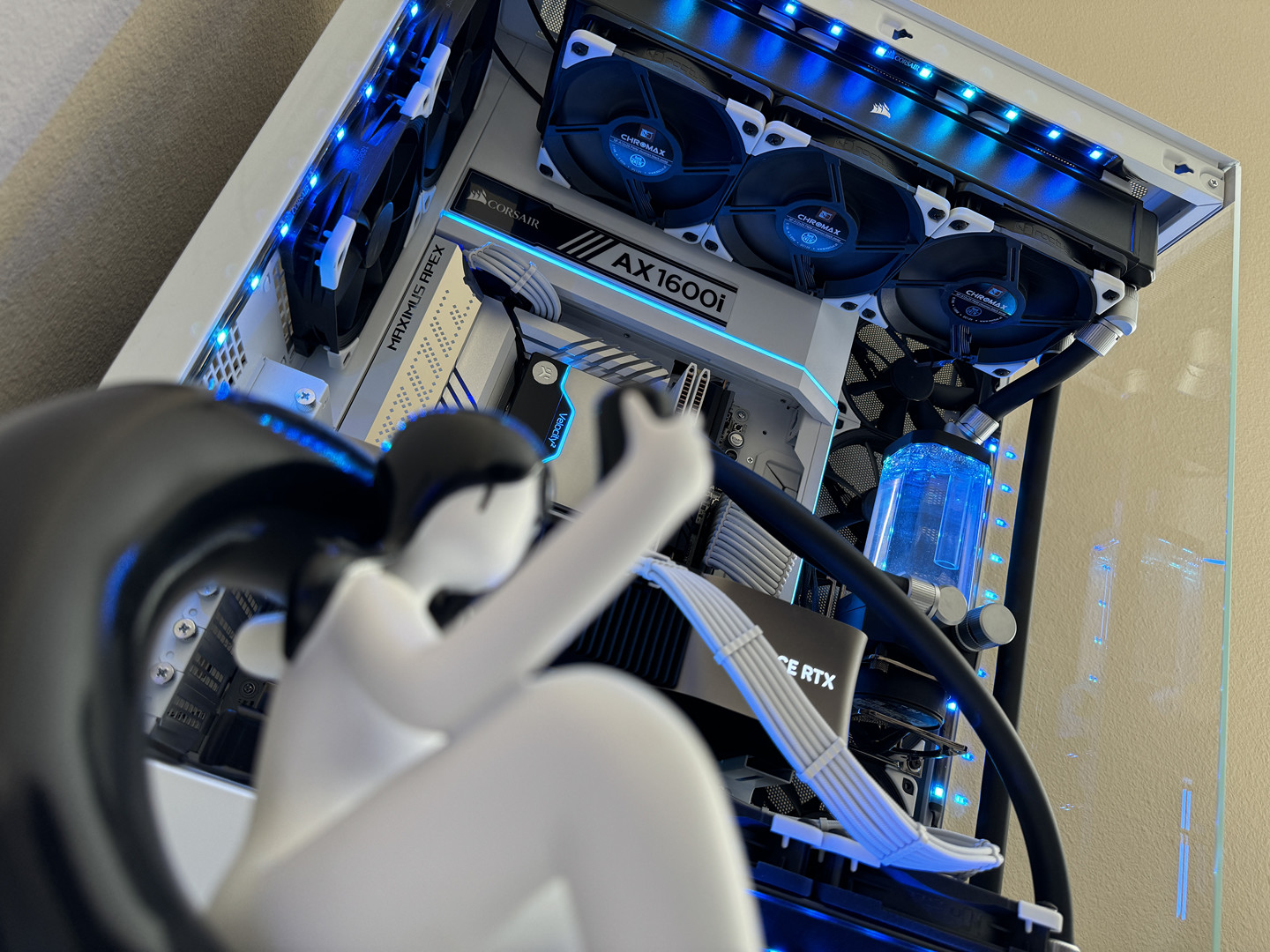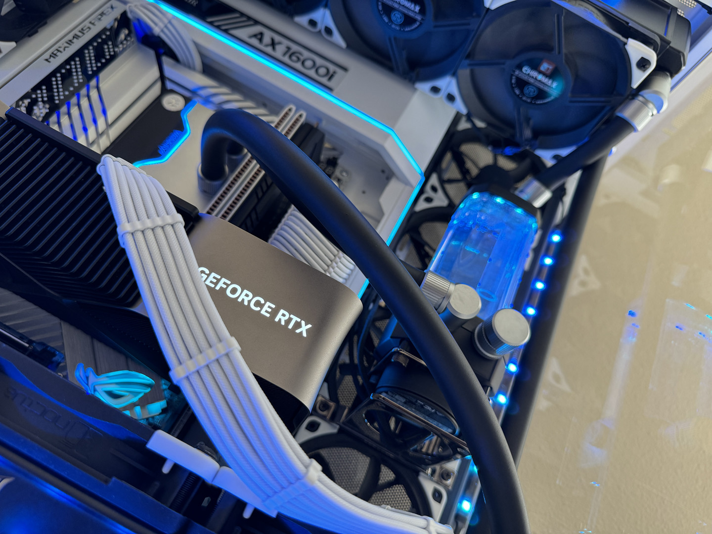 Airflow is handled by a hybrid array of 15 individually controlled fans. Intake is provided by 9 Noctua Chromax NF-A12x25 120mm fans and an additional 6 Noctua Chromax NF-S12A 120mm fans for exhaust. This setup requires the use of two Corsair Commander Core XTs for precise individual fan curve control, pump control and liquid temperature monitoring as well as full RGB control throughout the computer case.