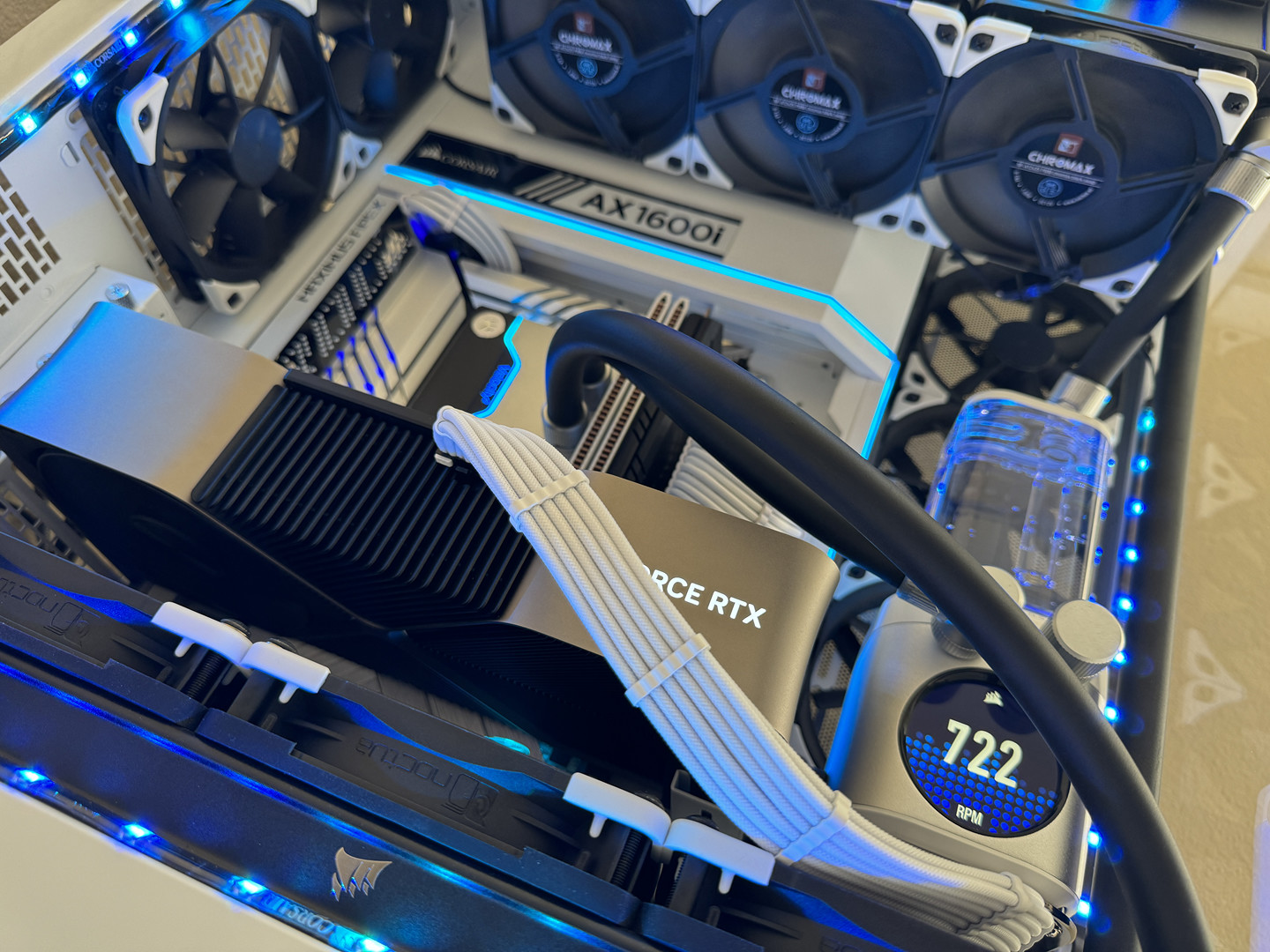 The top 360mm x 55mm radiator is set to intake cold air directly from outside of the case and is setup in a 6-fan push-pull configuration while bottom 360mm x 35mm radiator is only setup in a 3-fan push configuration, up through the radiator and into the GPU. After exiting through the back and top of the GPU, the air then meets in the middle of the case and is then exhausted out of either the back of the case or the side of the case. All exhaust fans are exclusively controlled by the GPU and idle at 0 RPM when the GPU is below 50c. The exhaust fans will only reach their max RPM should the GPU reach 70c. With this dual fan controller configuration, the system can remain exceptionally silent at idle, during moderate productivity use and during light gaming workload.