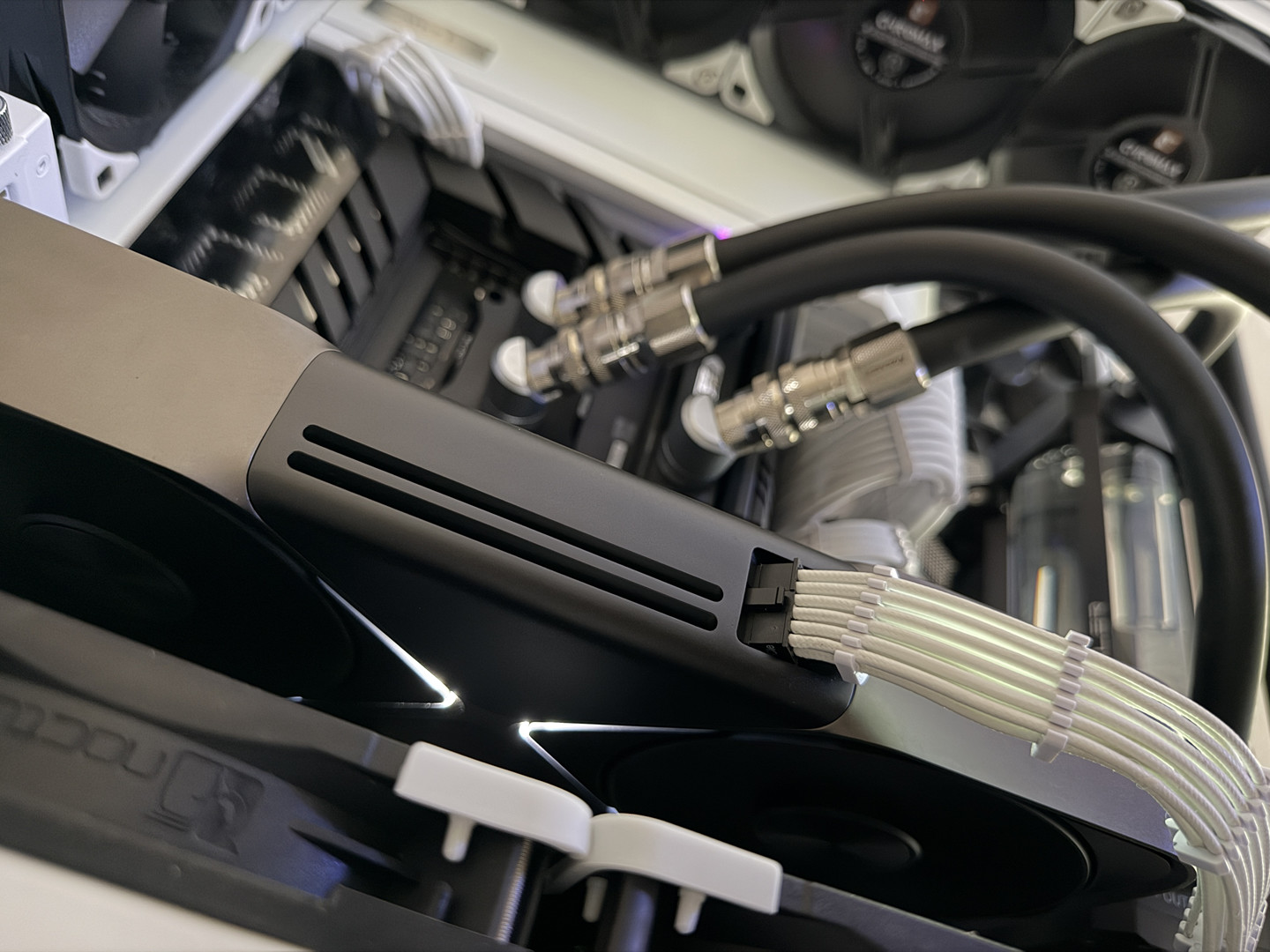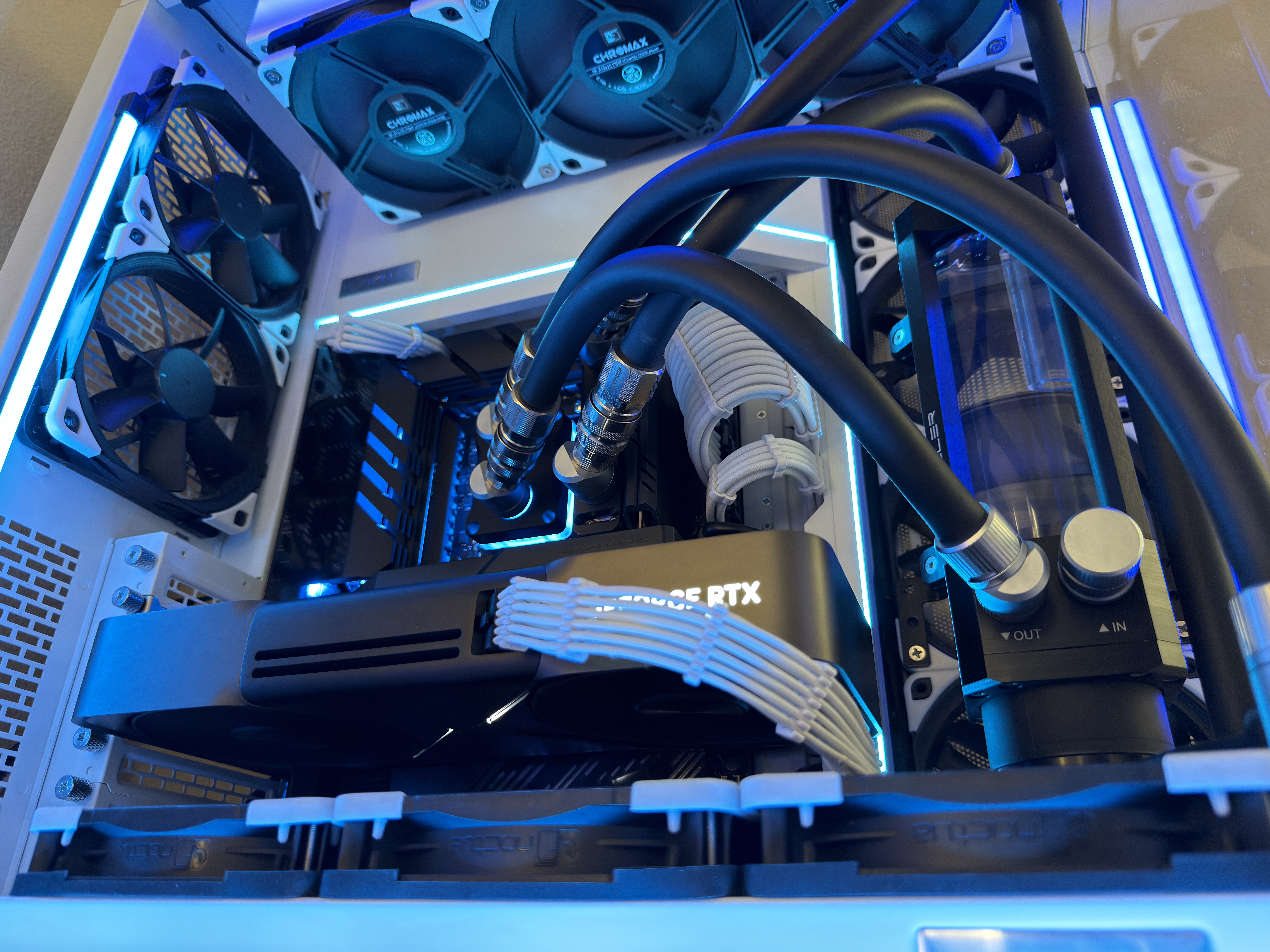Airflow is handled by a hybrid array of 15 individually controlled fans. Intake is provided by 9 Noctua Chromax NF-A12x25 120mm fans and an additional 6 Noctua Chromax NF-S12A 120mm fans for exhaust. This setup requires the use of two Corsair Commander Core XTs for precise individual fan curve control, pump control and liquid temperature monitoring as well as full RGB control throughout the computer case.