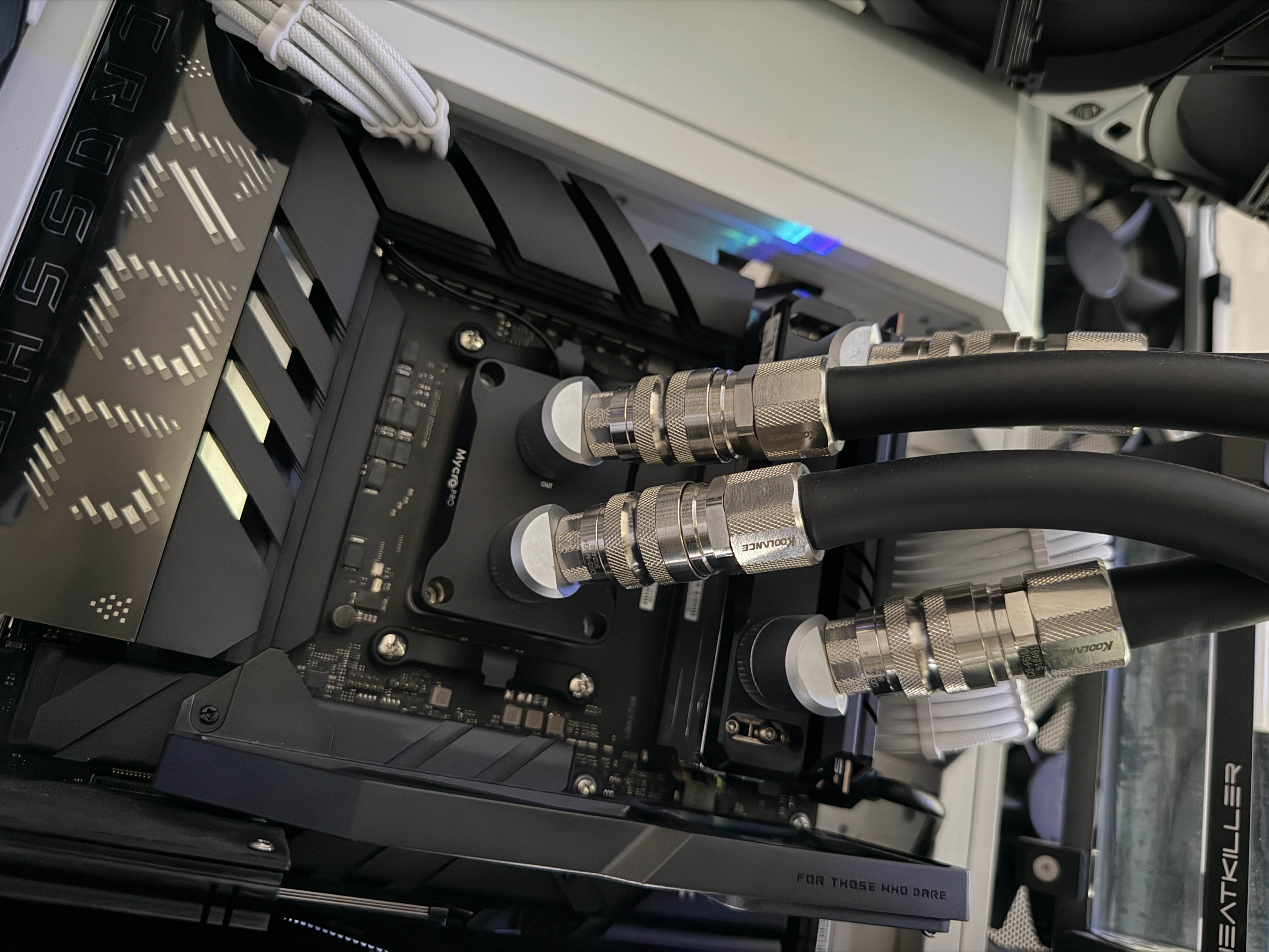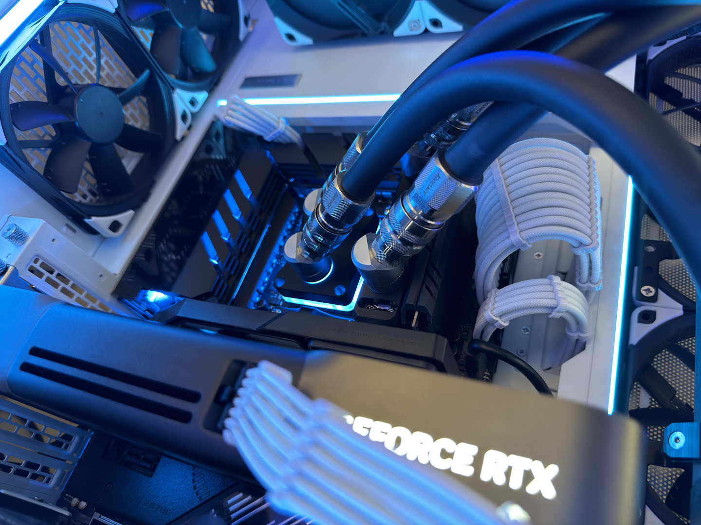 The top 360mm x 55mm Heatkiller RAD 360-L radiator is set to intake cold air directly from outside of the case and is setup in a 6-fan push-pull configuration while bottom 360mm x 35mm Heatkiller RAD 360-S radiator is only setup in a 3-fan push configuration, up through the radiator and into the GPU. After exiting through the back and top of the GPU, the air then meets in the middle of the case and is then exhausted out of either the back of the case or the side of the case.