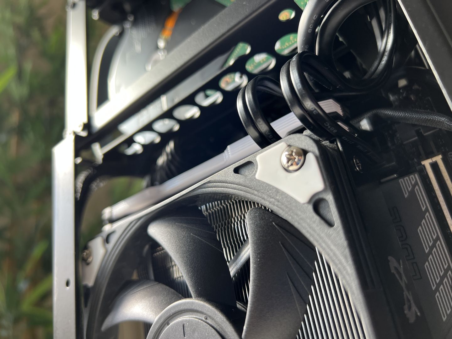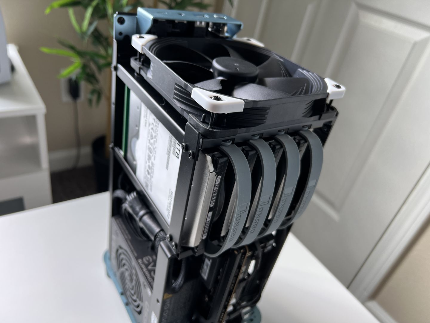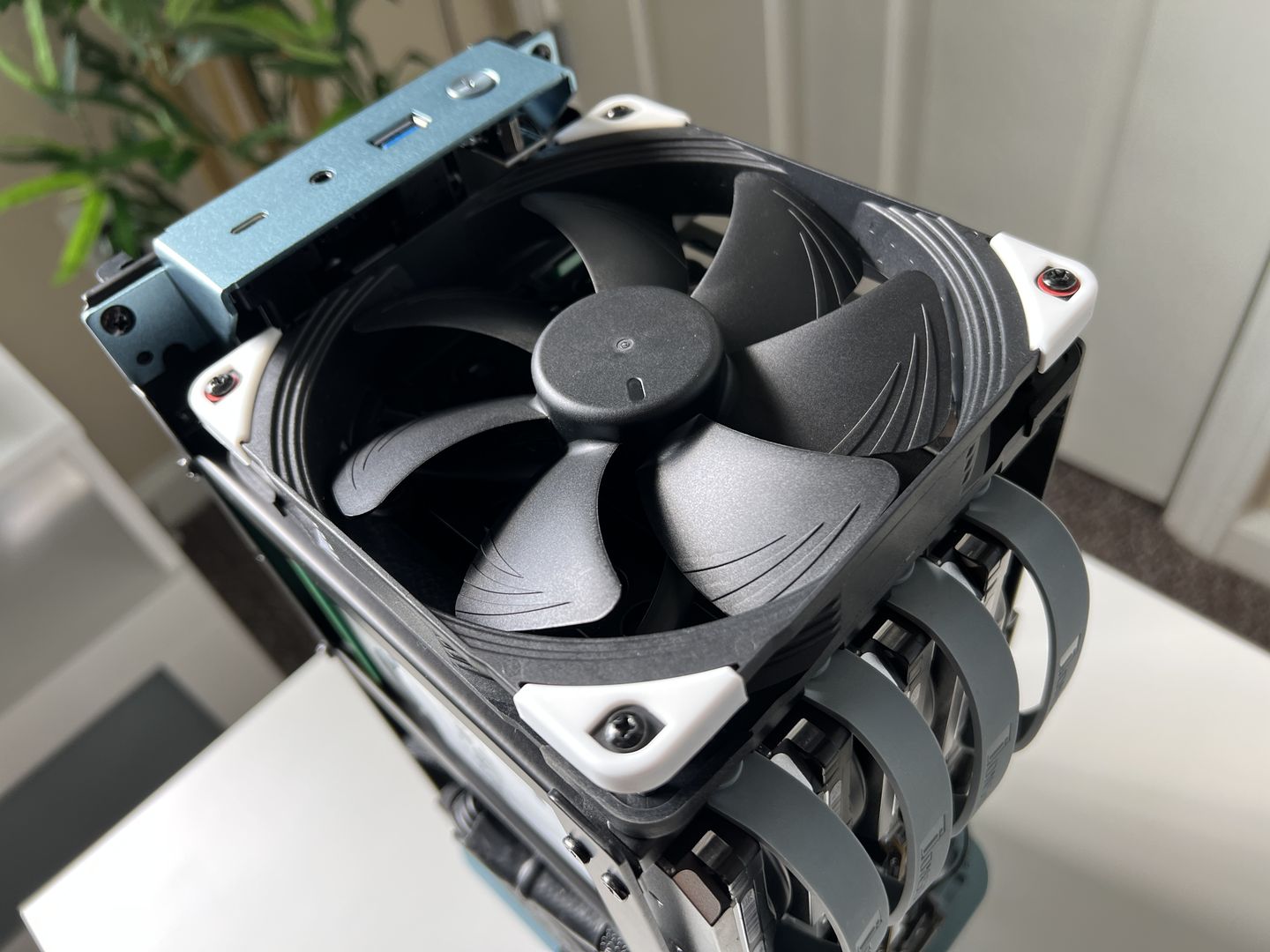 Cooling is handled by a Scythe Big Shuriken 3, paired with a 120mm Noctua Chromax NF-A12x15 for the CPU, VRM and memory while the RAID-6 array is actively cooled by a single 140mm Noctua Chromax NF-A14. Cold air is taken in directly from the outside of the case through the perforated side panel to cool the CPU and is exhausted downwards. As for the storage, cold air is taken in through the top of the case, through the storage array and is then exhausted out of the bottom of the case following the flow of the fin stack direction of the CPU cooler. With this multi-chamber cooling setup for the various components, this allows the server to achieve a very efficient cooling profile and remain nearly silent, aside from periodic drive seeking noises.