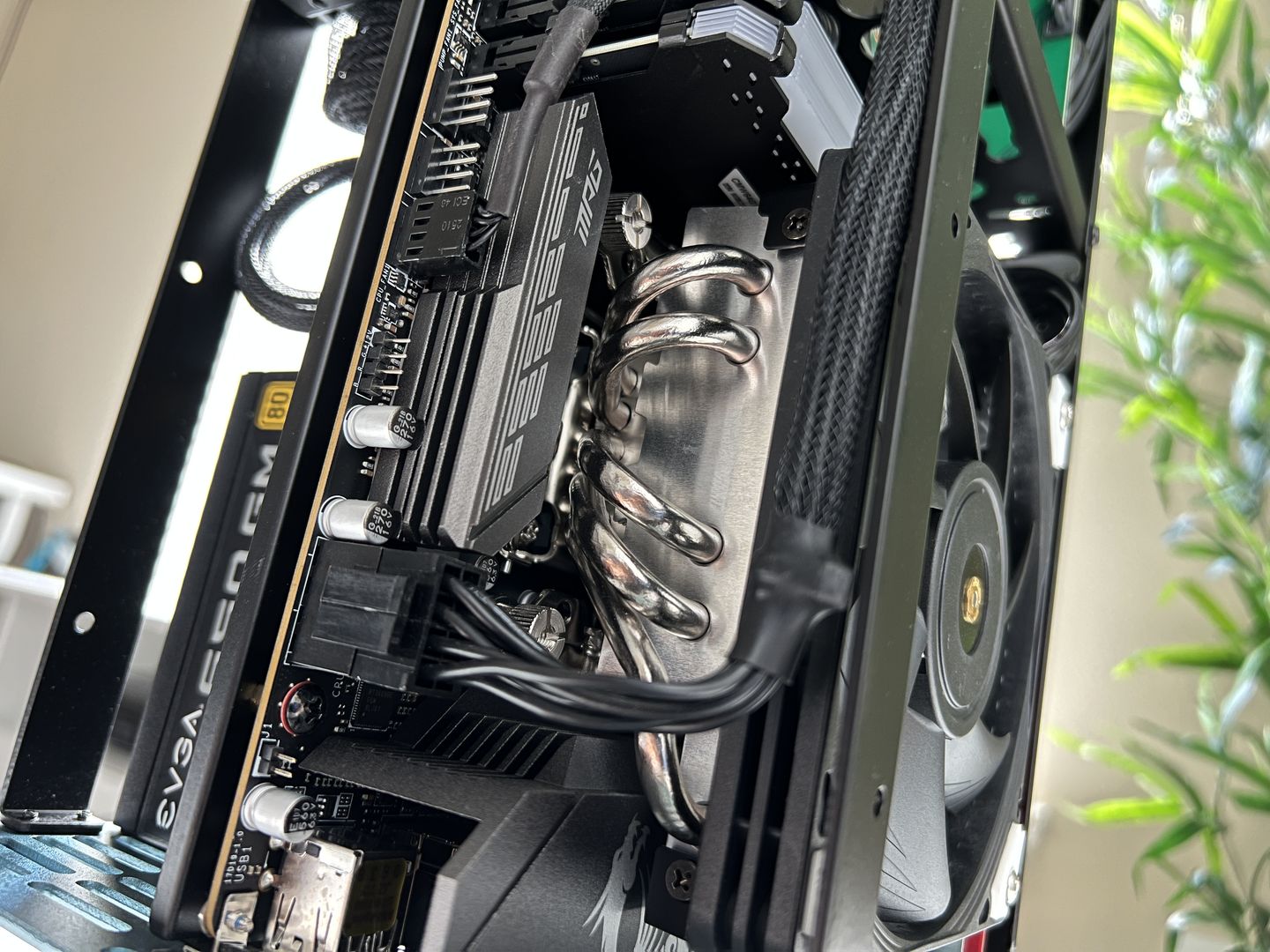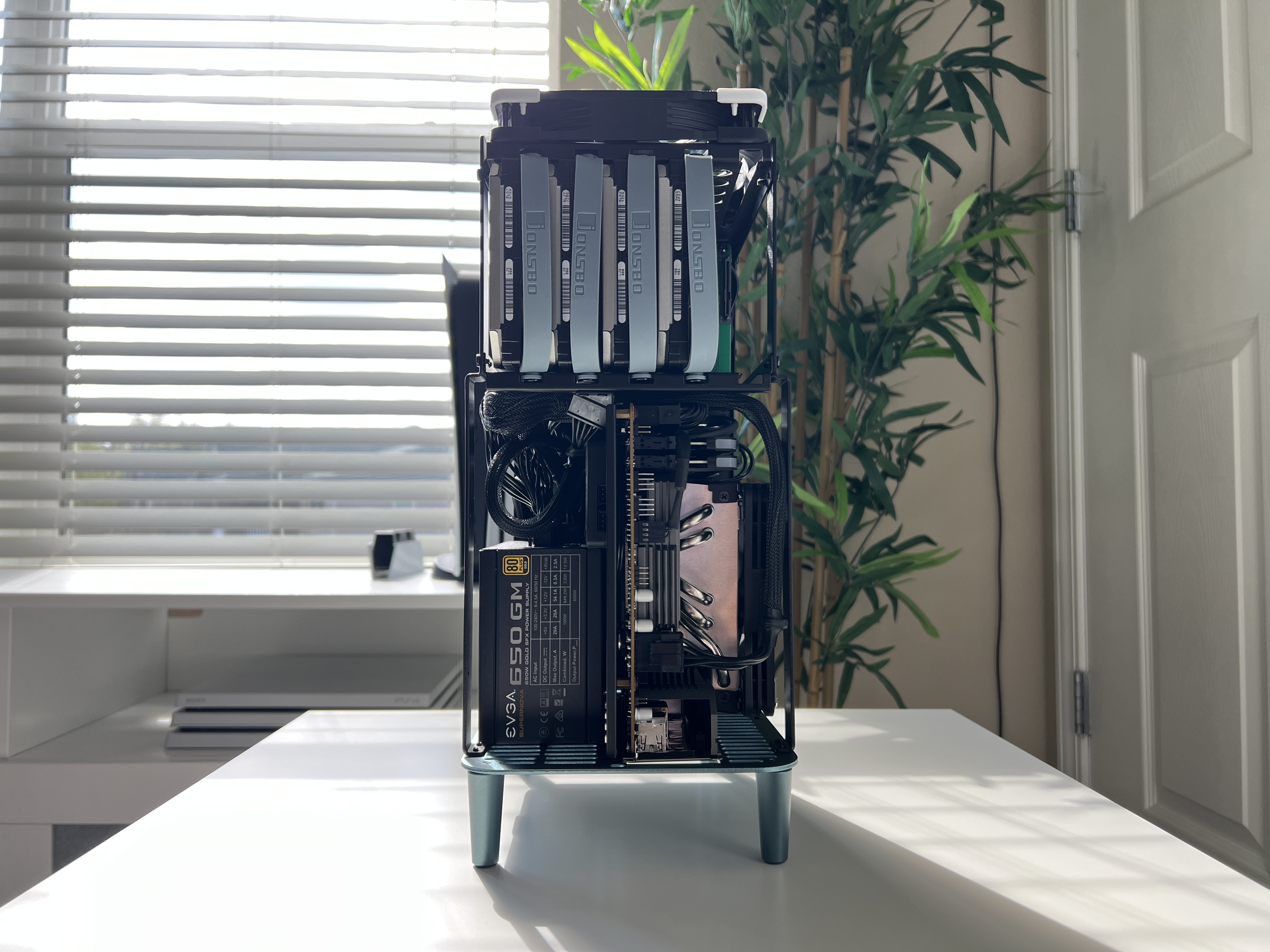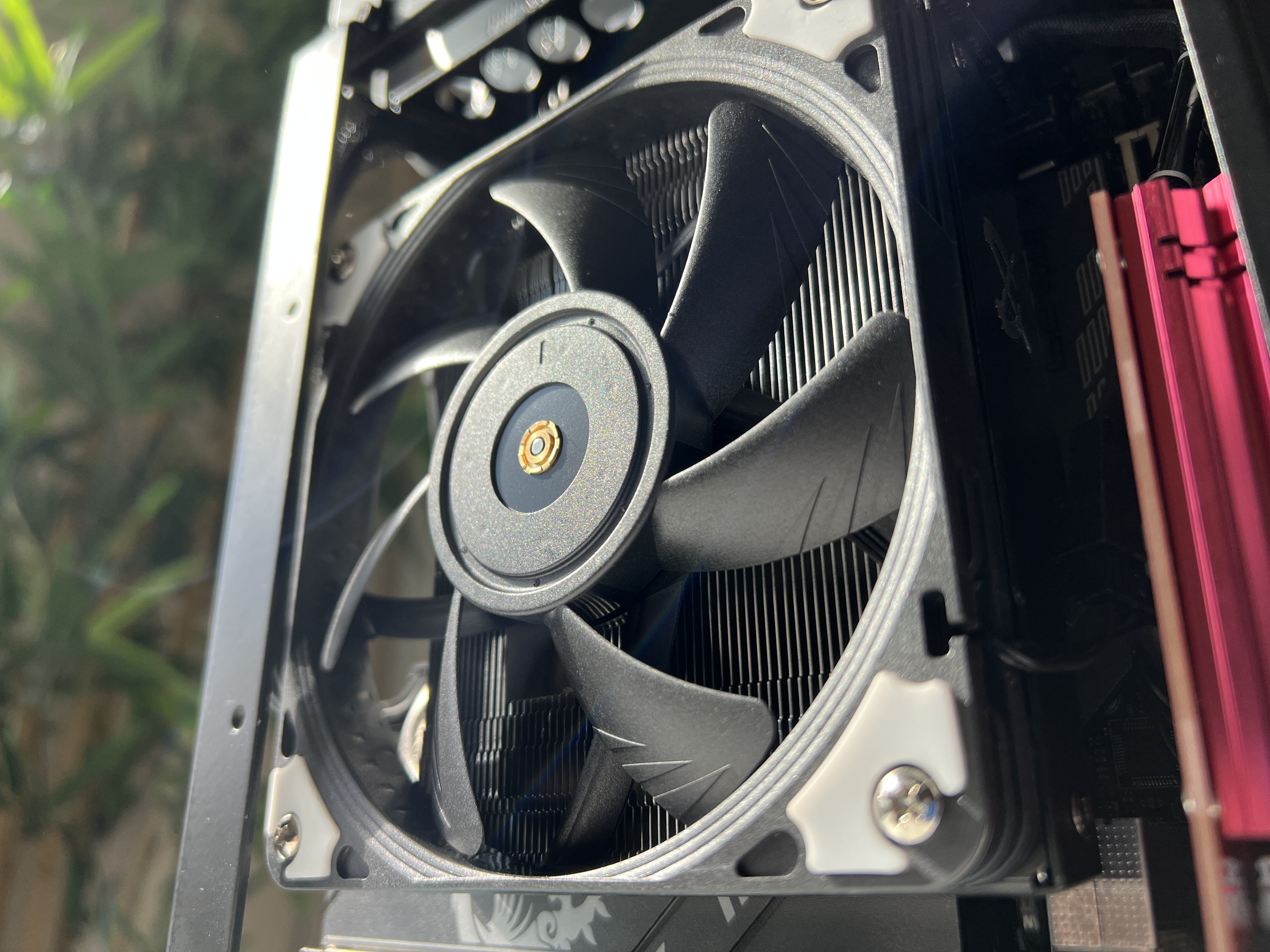 Cooling is handled by a Scythe Big Shuriken 3, paired with a 120mm Noctua Chromax NF-A12x15 for the CPU, VRM and memory while the RAID-6 array is actively cooled by a single 140mm Noctua Chromax NF-A14. Cold air is taken in directly from the outside of the case through the perforated side panel to cool the CPU and is exhausted downwards. As for the storage, cold air is taken in through the top of the case, through the storage array and is then exhausted out of the bottom of the case following the flow of the fin stack direction of the CPU cooler. With this multi-chamber cooling setup for the various components, this allows the server to achieve a very efficient cooling profile and remain nearly silent, aside from periodic drive seeking noises.