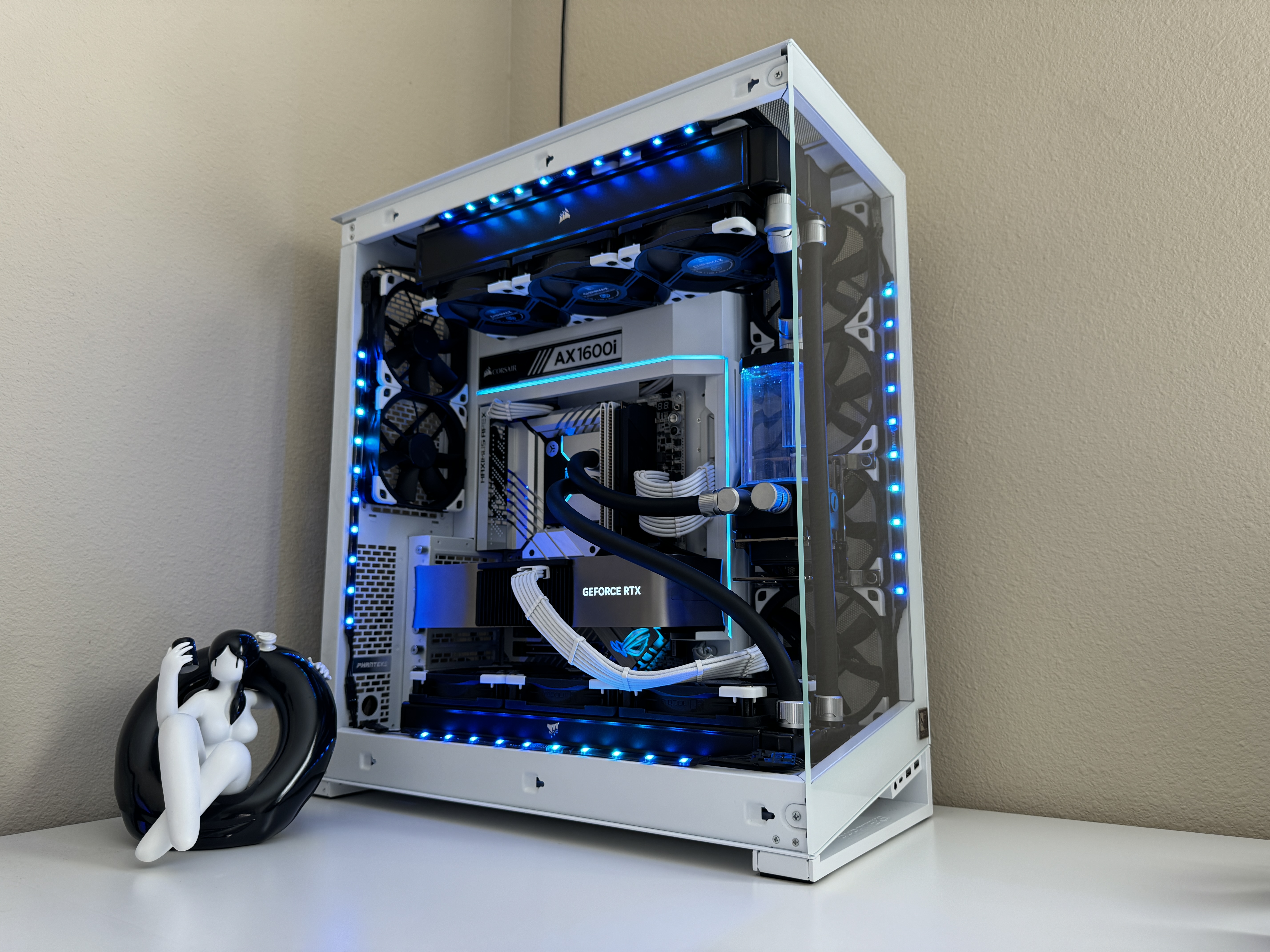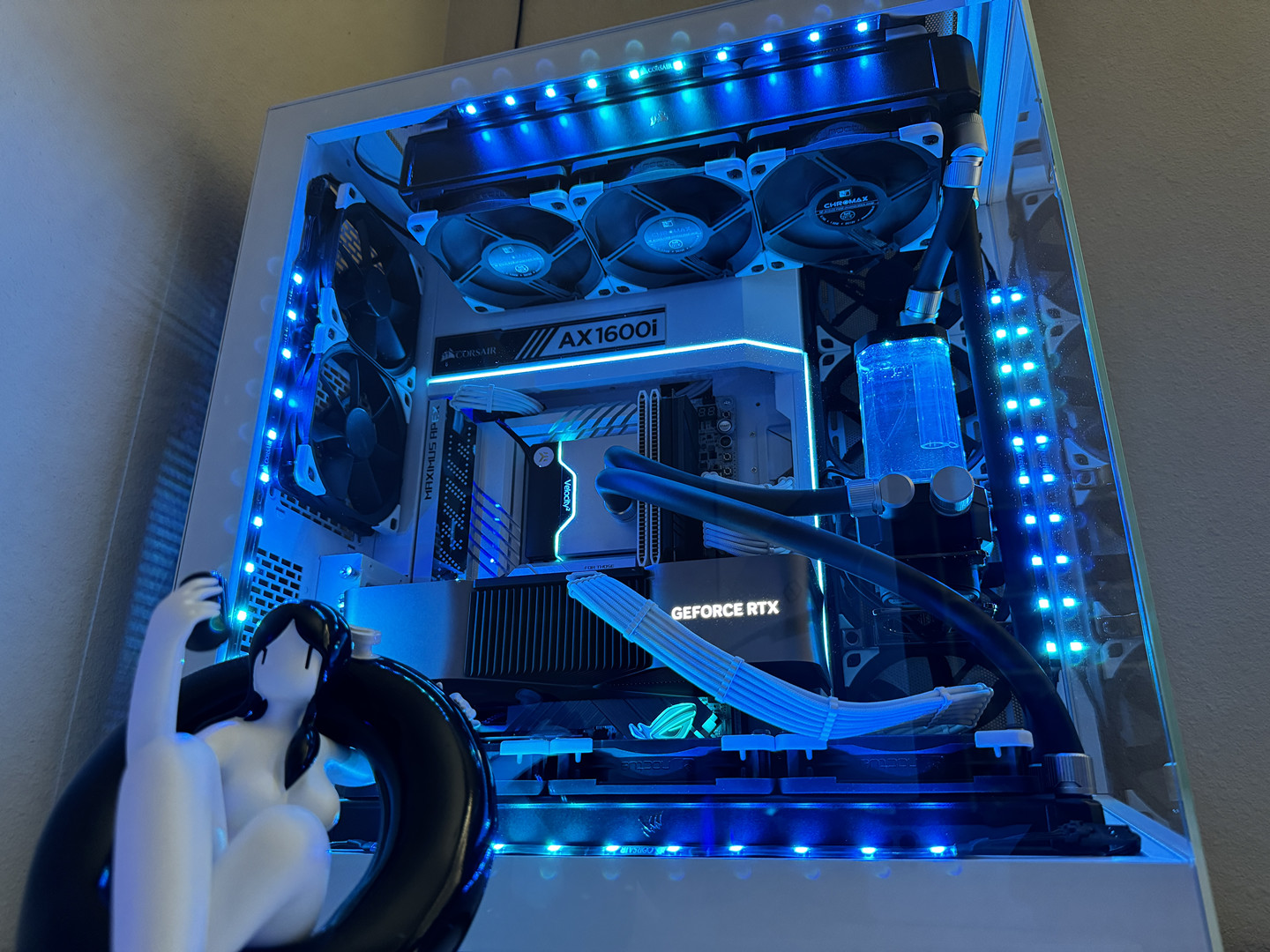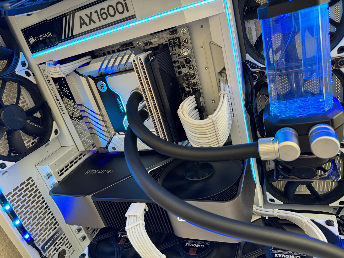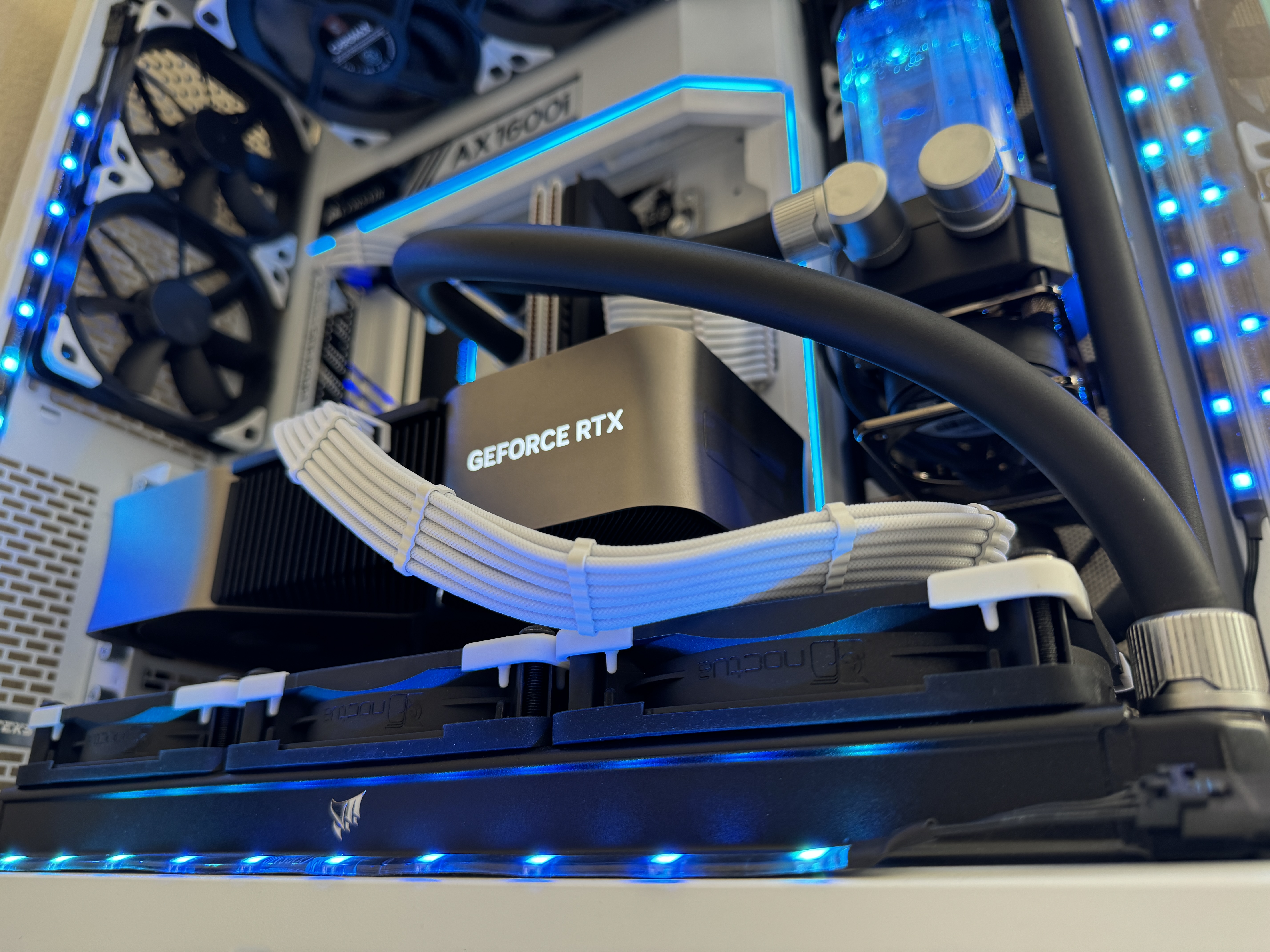 Airflow is handled by a hybrid array of 15 individually controlled fans. Intake is provided by 9 Noctua Chromax NF-A12x25 120mm fans and an additional 6 Noctua Chromax NF-S12A 120mm fans for exhaust. This setup requires the use of two Corsair Commander Core XTs for precise individual fan curve control, pump control and liquid temperature monitoring as well as full RGB control throughout the computer case.