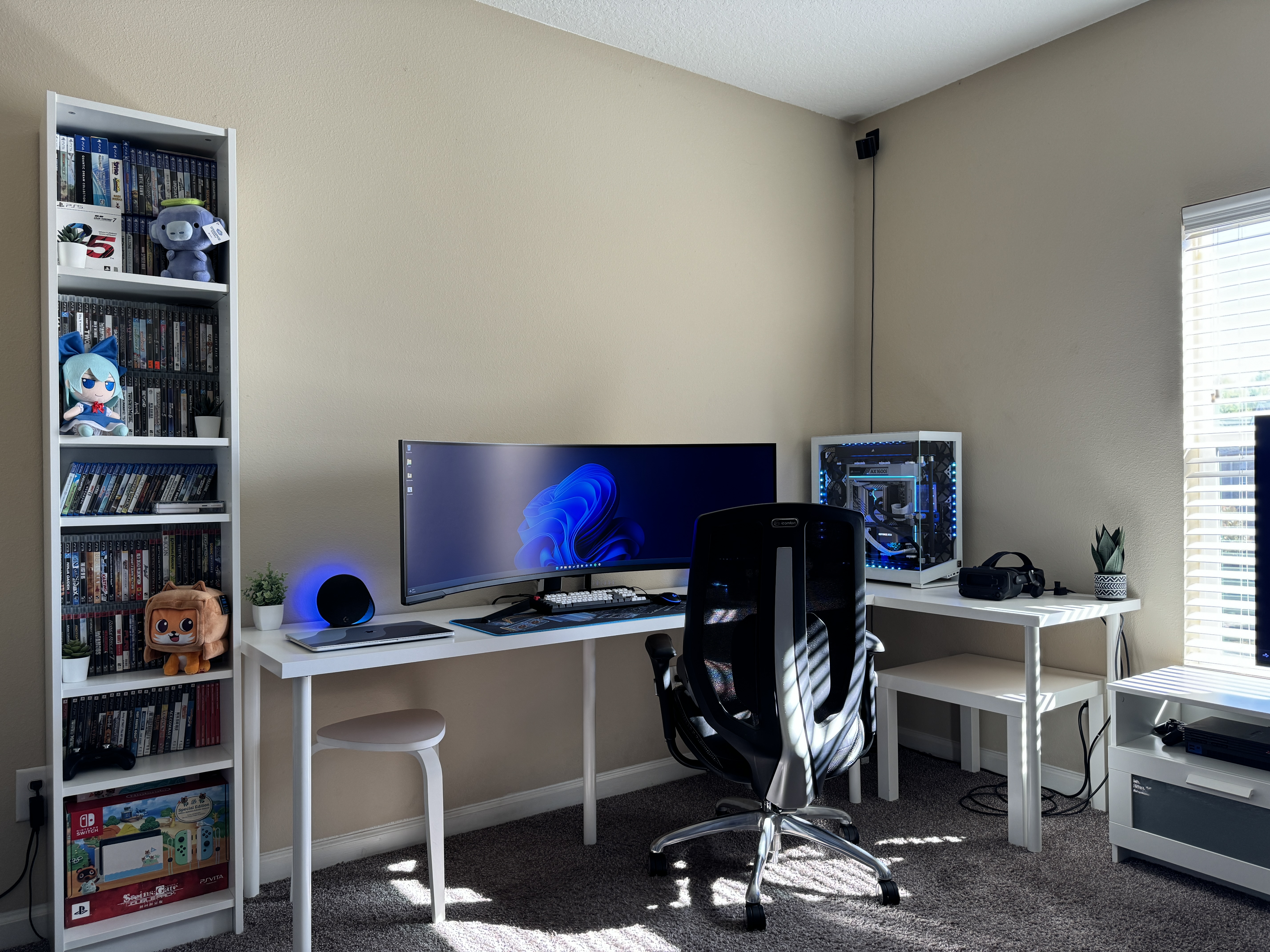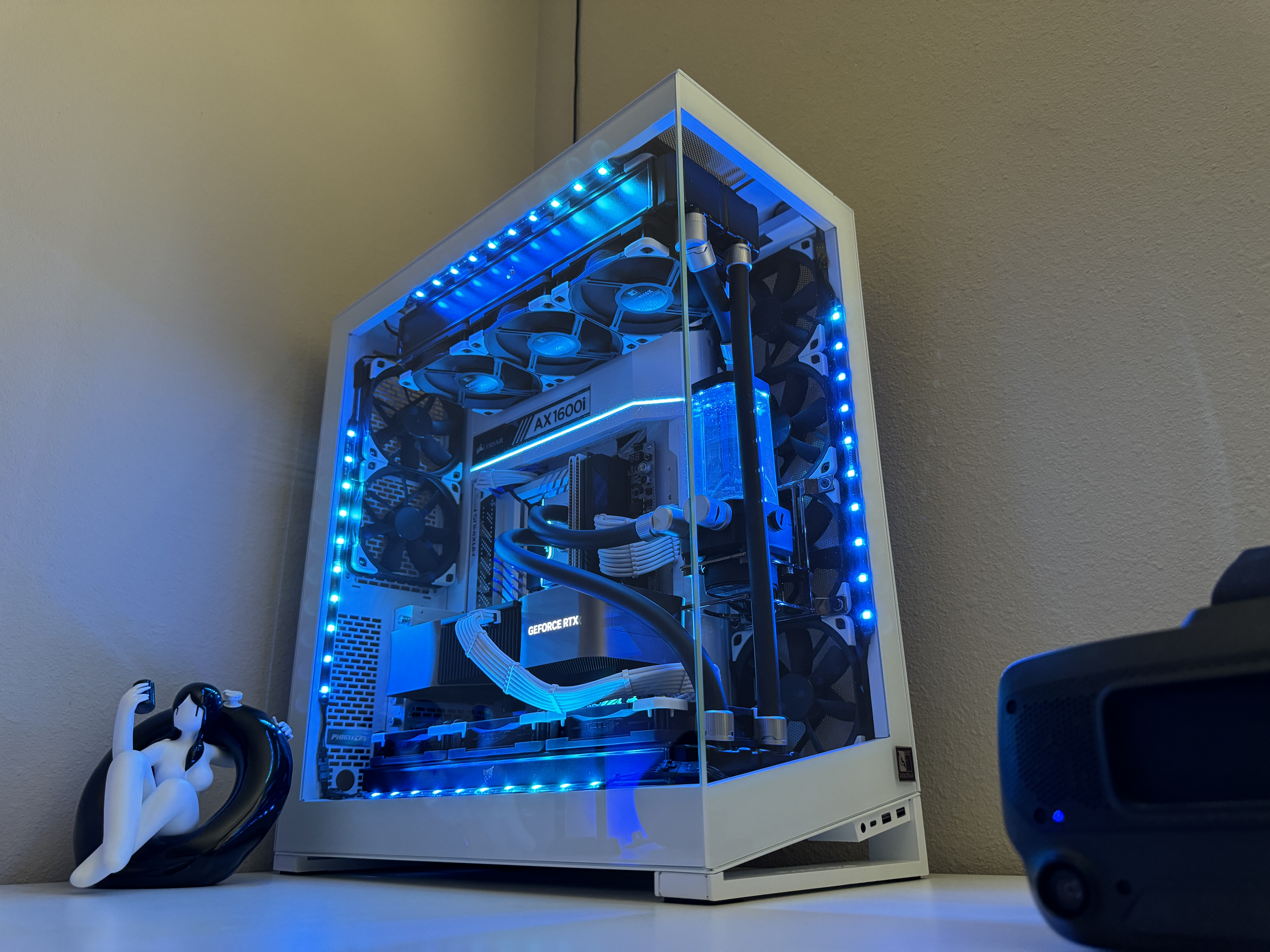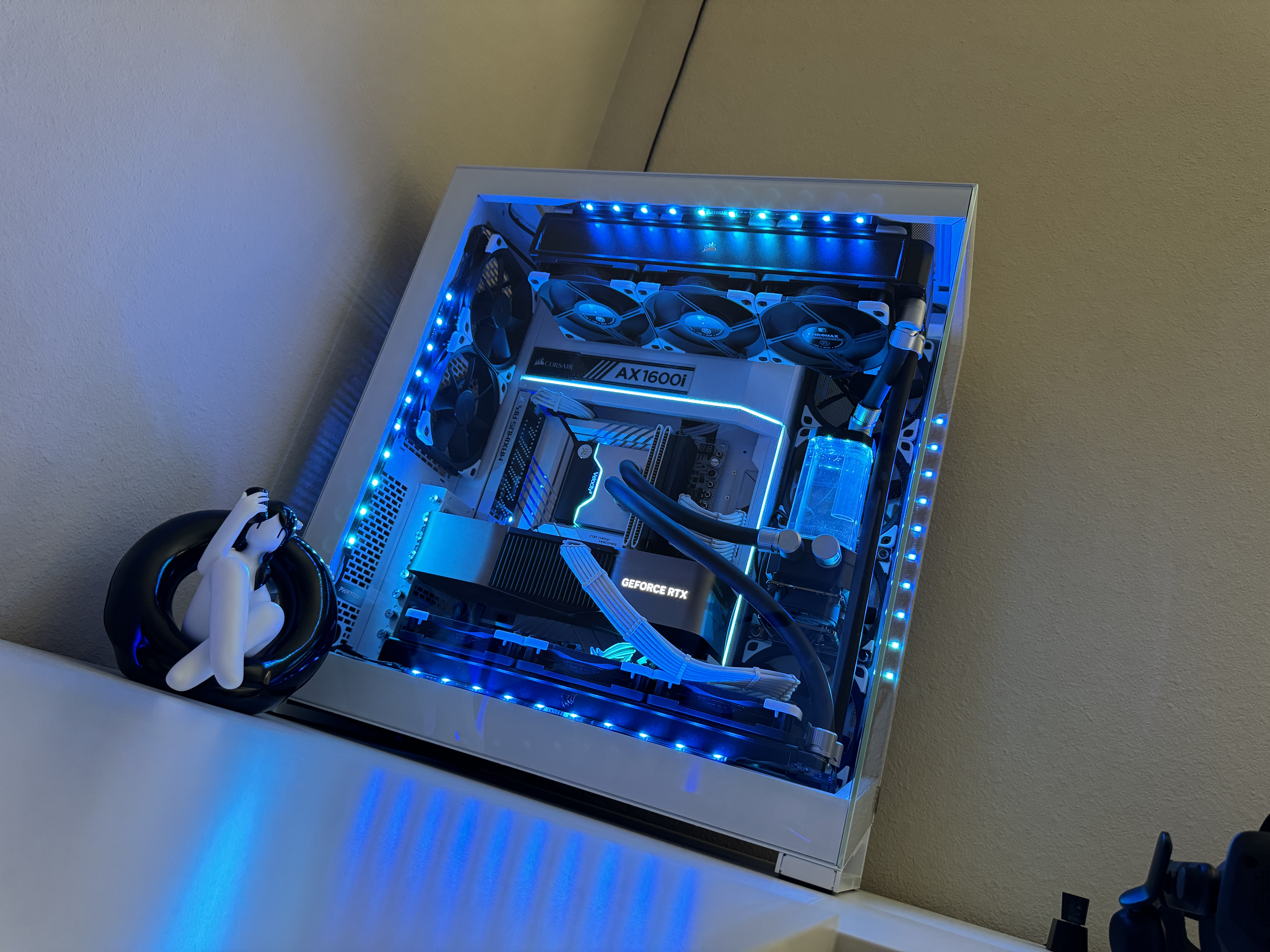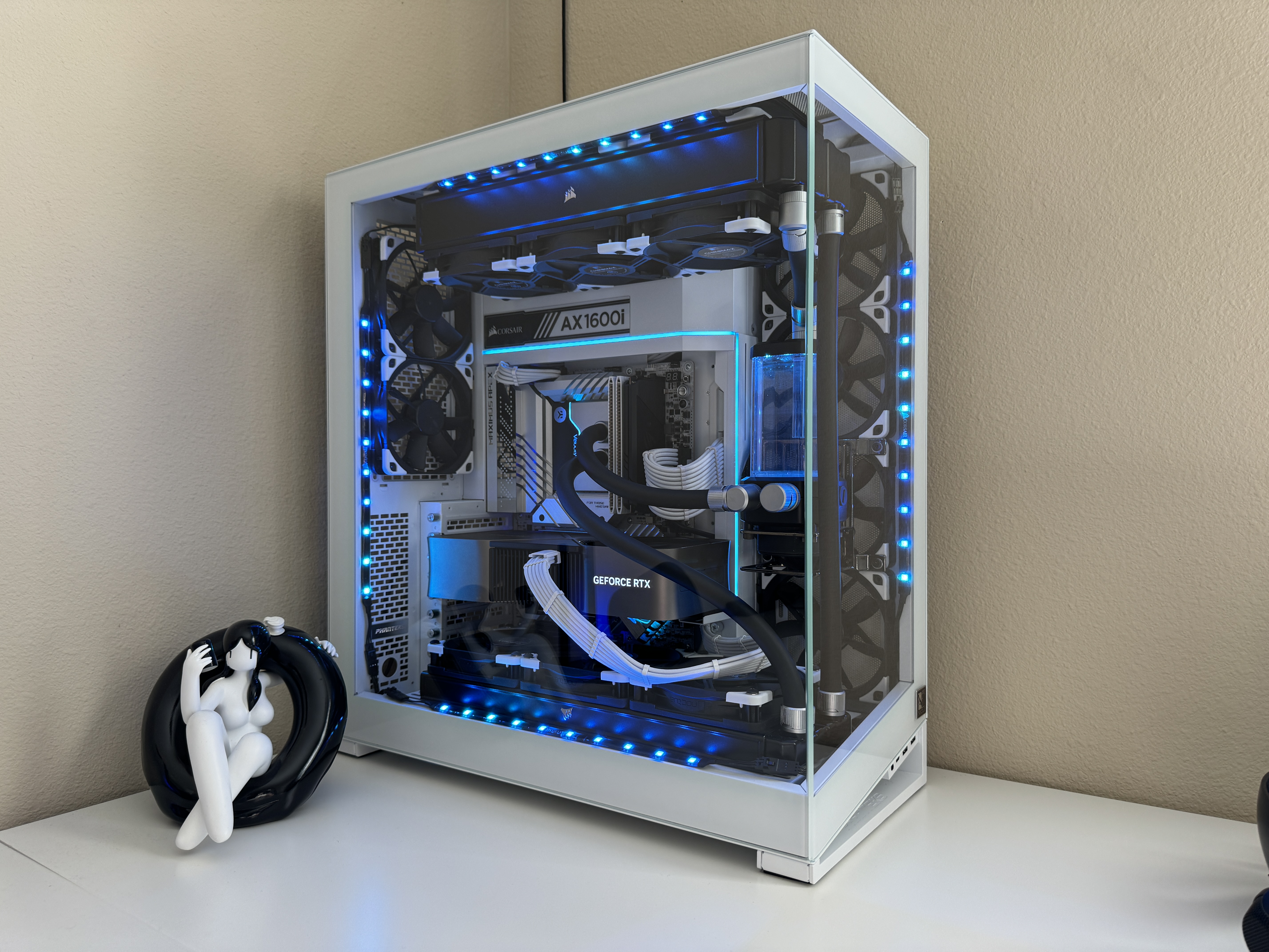 Airflow is handled by a hybrid array of 15 individually controlled fans. Intake is provided by 9 Noctua Chromax NF-A12x25 120mm fans and an additional 6 Noctua Chromax NF-S12A 120mm fans for exhaust. This setup requires the use of two Corsair Commander Core XTs for precise individual fan curve control, pump control and liquid temperature monitoring as well as full RGB control throughout the computer case.
