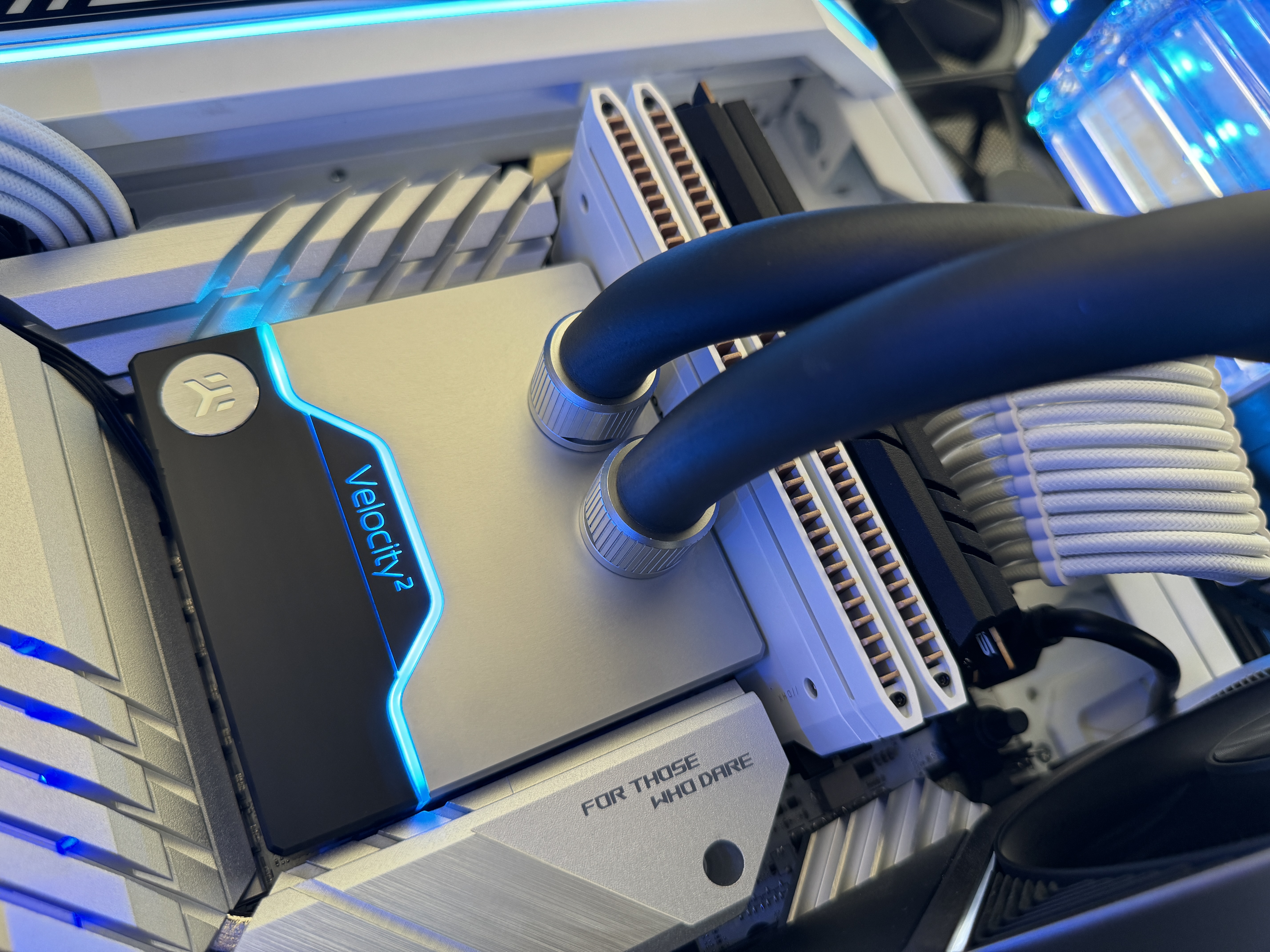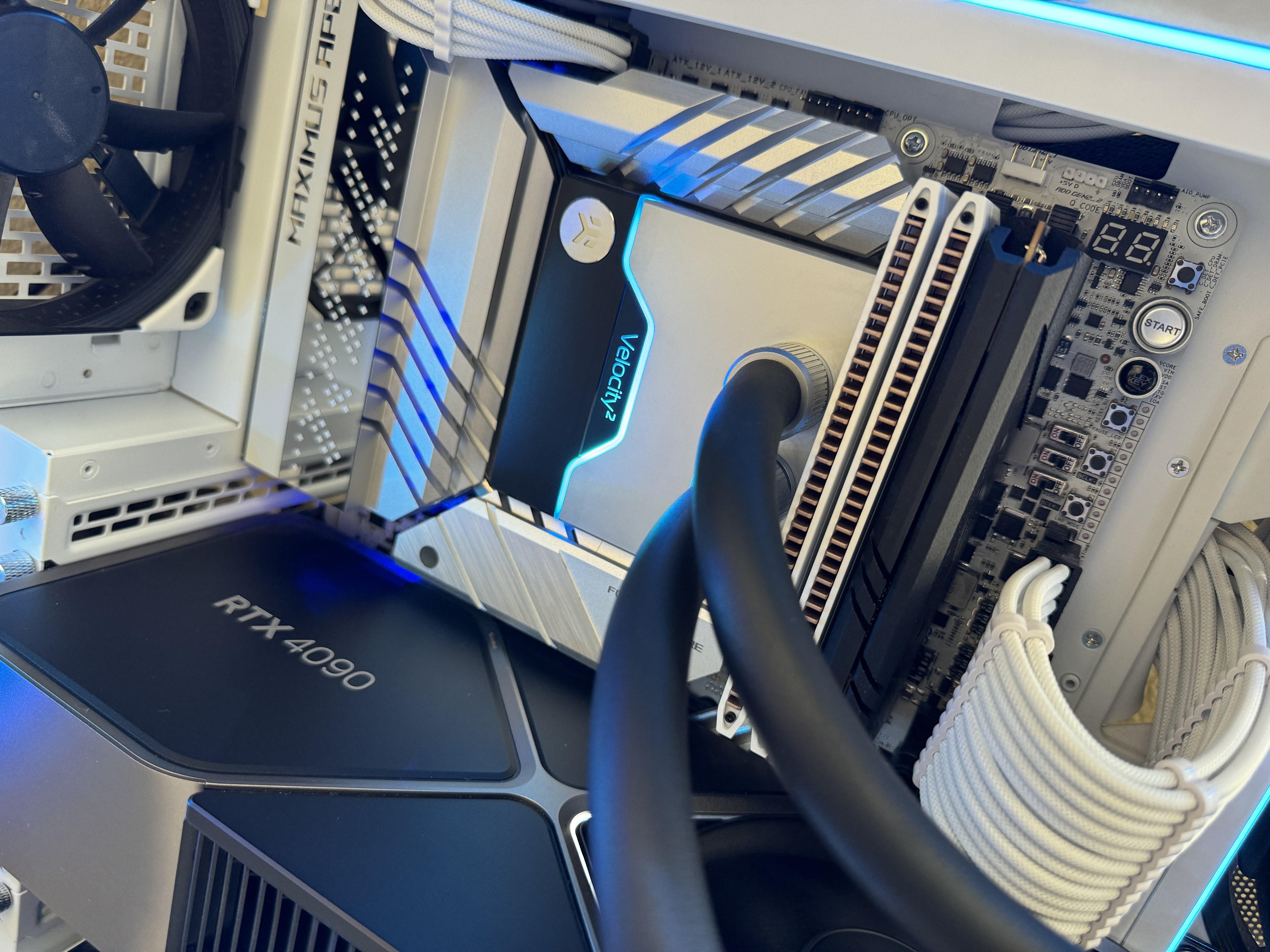 The top 360mm x 55mm radiator is set to intake cold air directly from outside of the case and is setup in a 6-fan push-pull configuration while bottom 360mm x 35mm radiator is only setup in a 3-fan push configuration, up through the radiator and into the GPU. After exiting through the back and top of the GPU, the air then meets in the middle of the case and is then exhausted out of either the back of the case or the side of the case. All exhaust fans are exclusively controlled by the GPU and idle at 0 RPM when the GPU is below 50c. The exhaust fans will only reach their max RPM should the GPU reach 70c. With this dual fan controller configuration, the system can remain exceptionally silent at idle, during moderate productivity use and during light gaming workload.