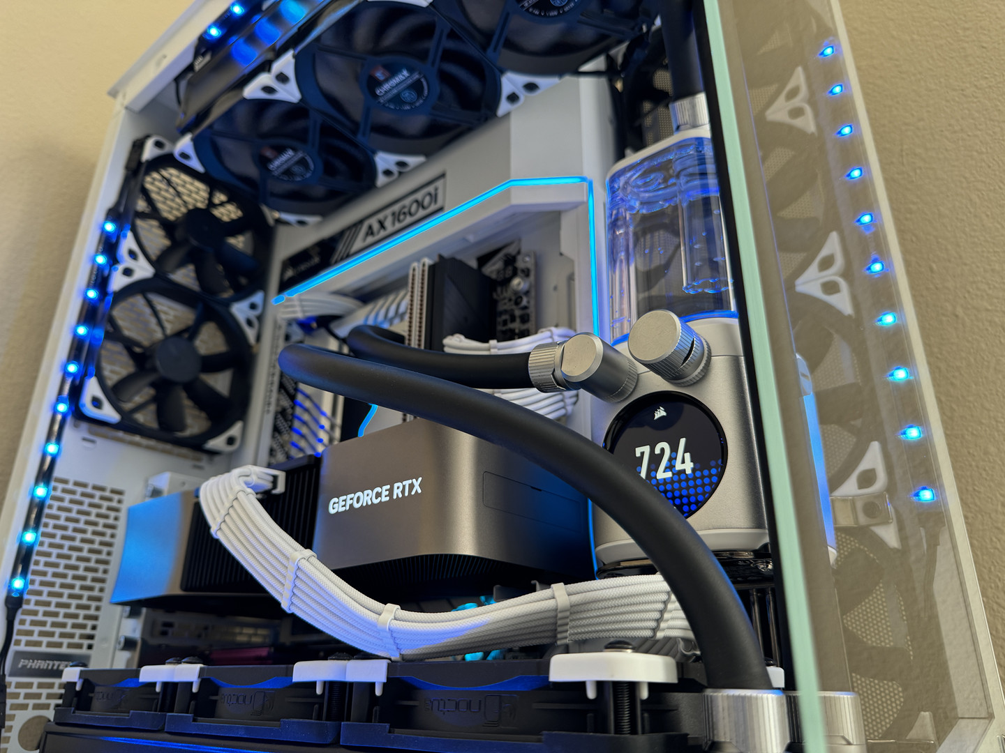 The top 360mm x 55mm radiator is set to intake cold air directly from outside of the case and is setup in a 6-fan push-pull configuration while bottom 360mm x 35mm radiator is only setup in a 3-fan push configuration, up through the radiator and into the GPU. After exiting through the back and top of the GPU, the air then meets in the middle of the case and is then exhausted out of either the back of the case or the side of the case. All exhaust fans are exclusively controlled by the GPU and idle at 0 RPM when the GPU is below 50c. The exhaust fans will only reach their max RPM should the GPU reach 70c. With this dual fan controller configuration, the system can remain exceptionally silent at idle, during moderate productivity use and during light gaming workload.
