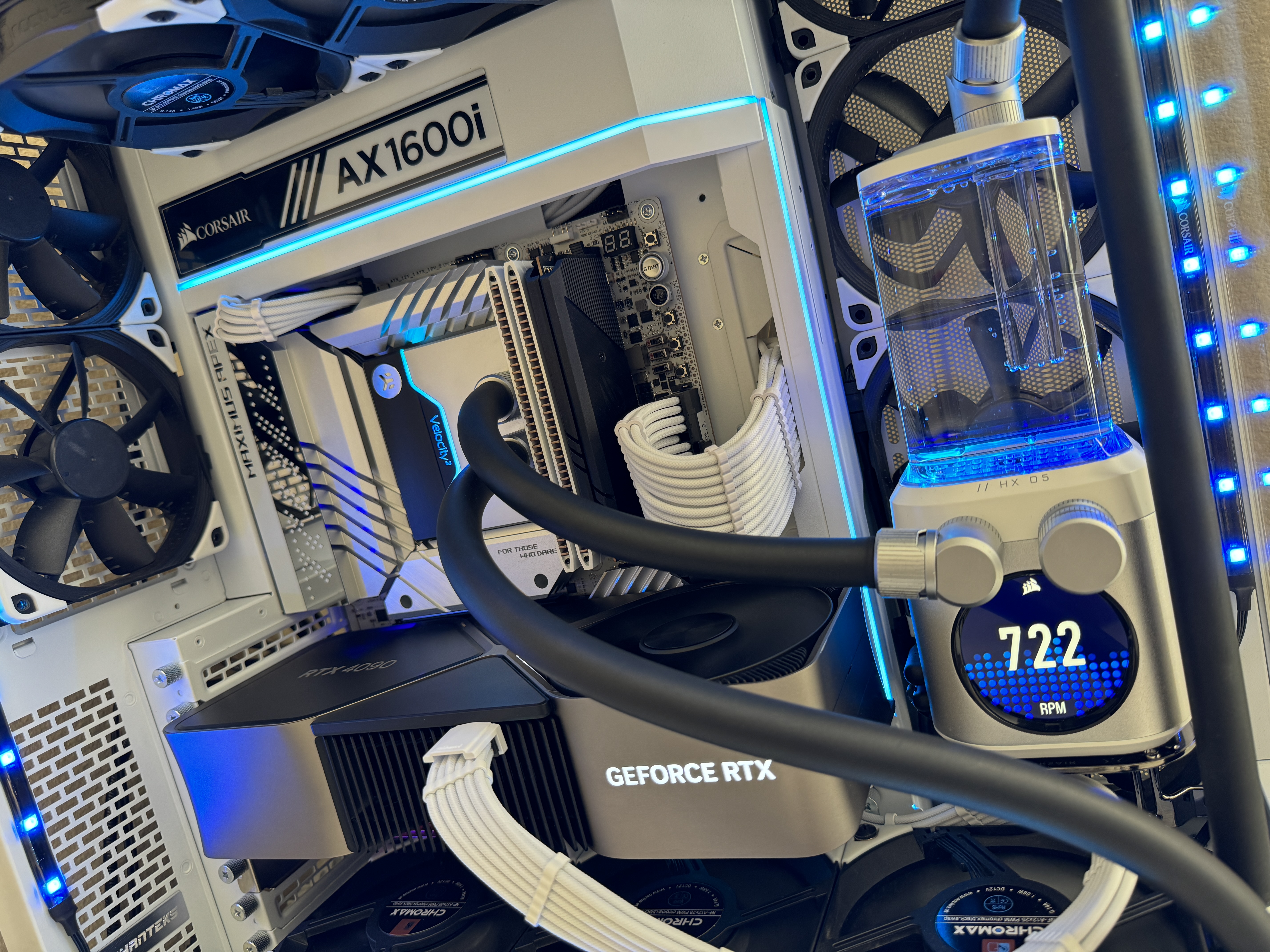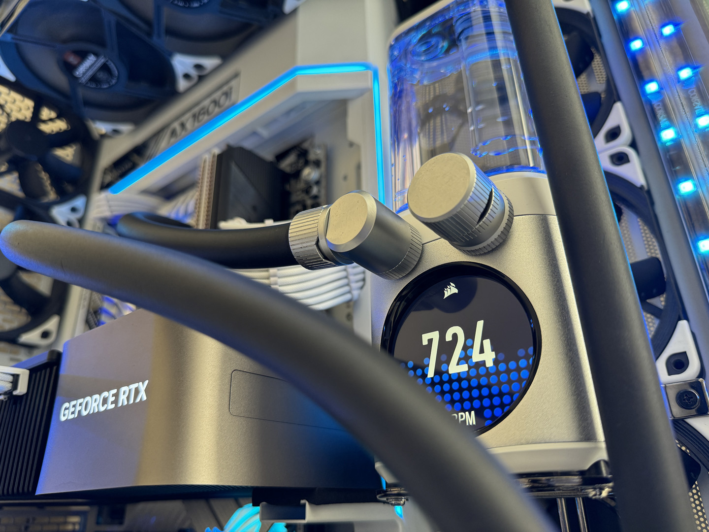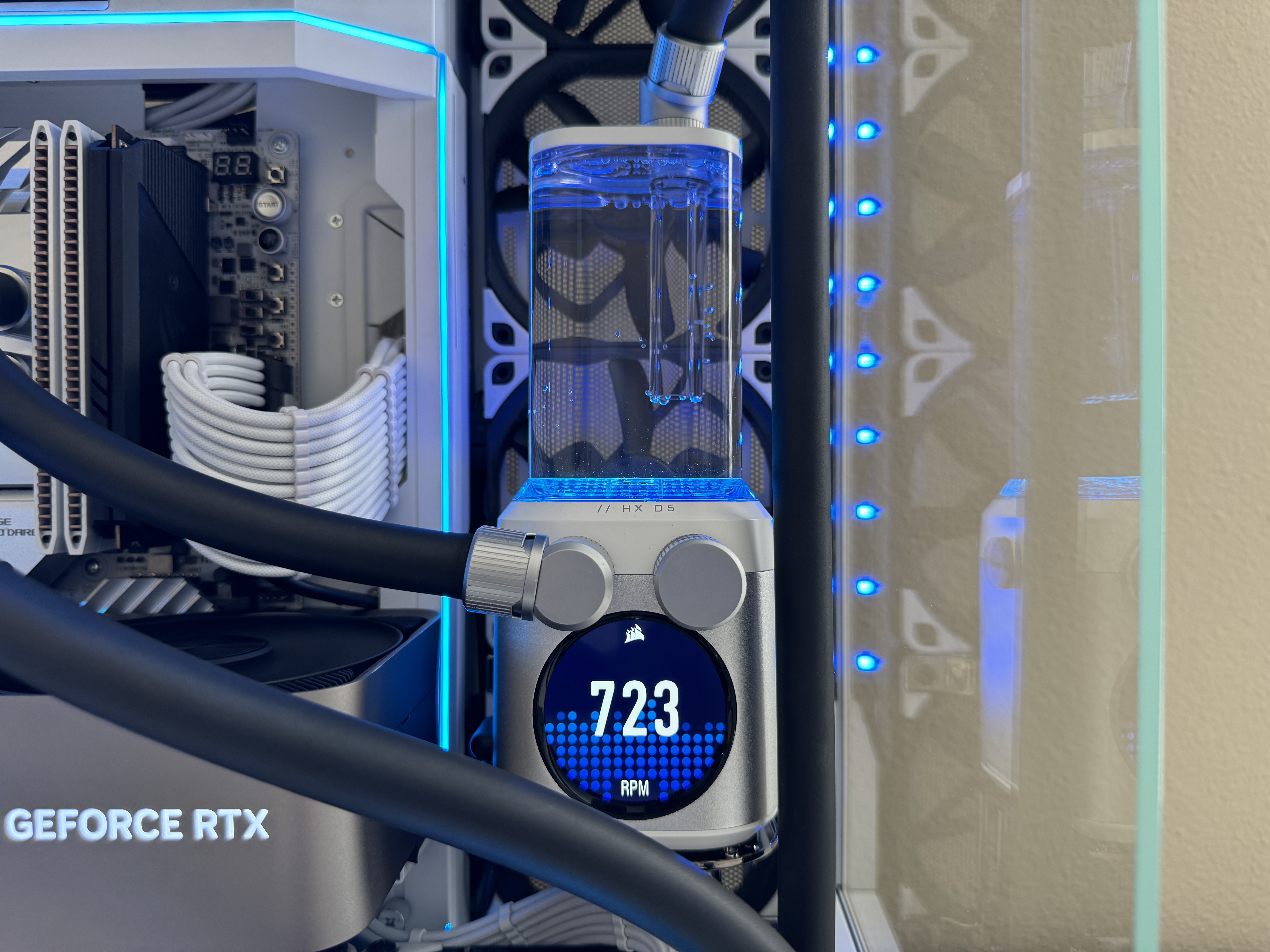 Responsive fan and pump control is critical when it comes to regulating the amount of heat moved away from the CPU block. Fluid flow is driven by a 330mL Corsair iCUE Link XD5 RGB ELITE LCD D5 pump. It is dynamically controlled by one of the dual Corsair Commander Core XT devices based on both liquid and CPU core temperature with a maximum of speed of 4800RPM at 35c liquid or 85c core.