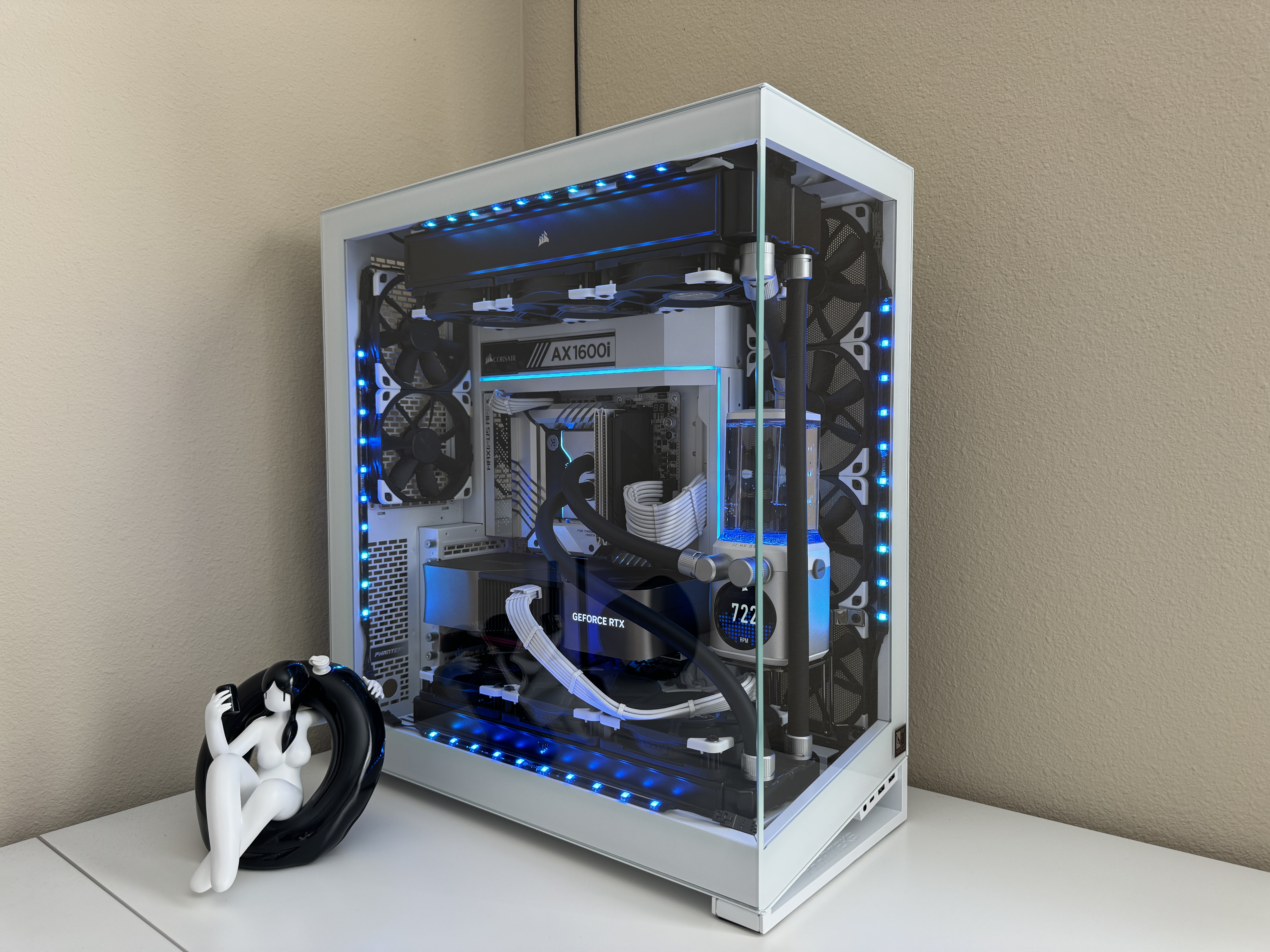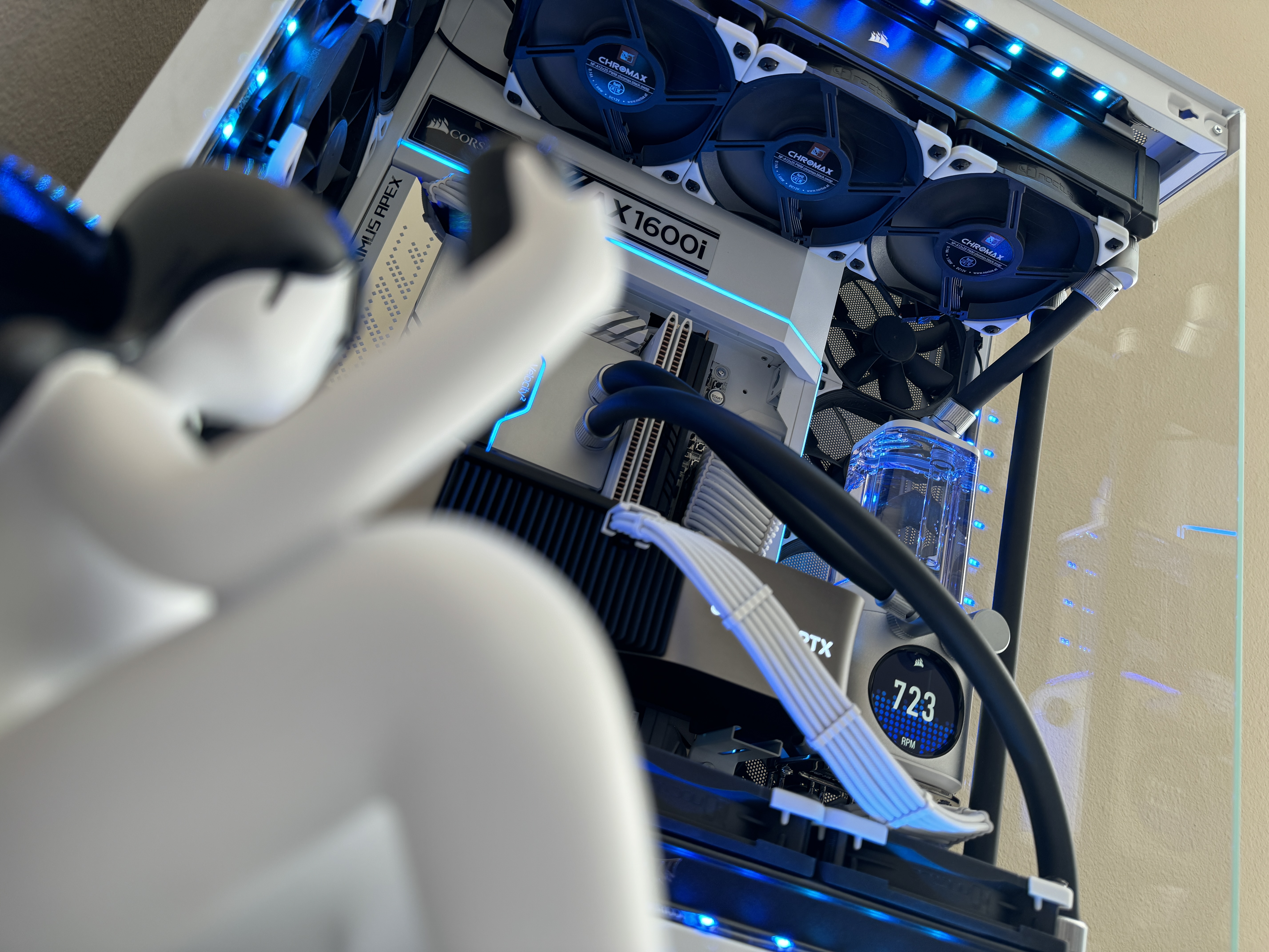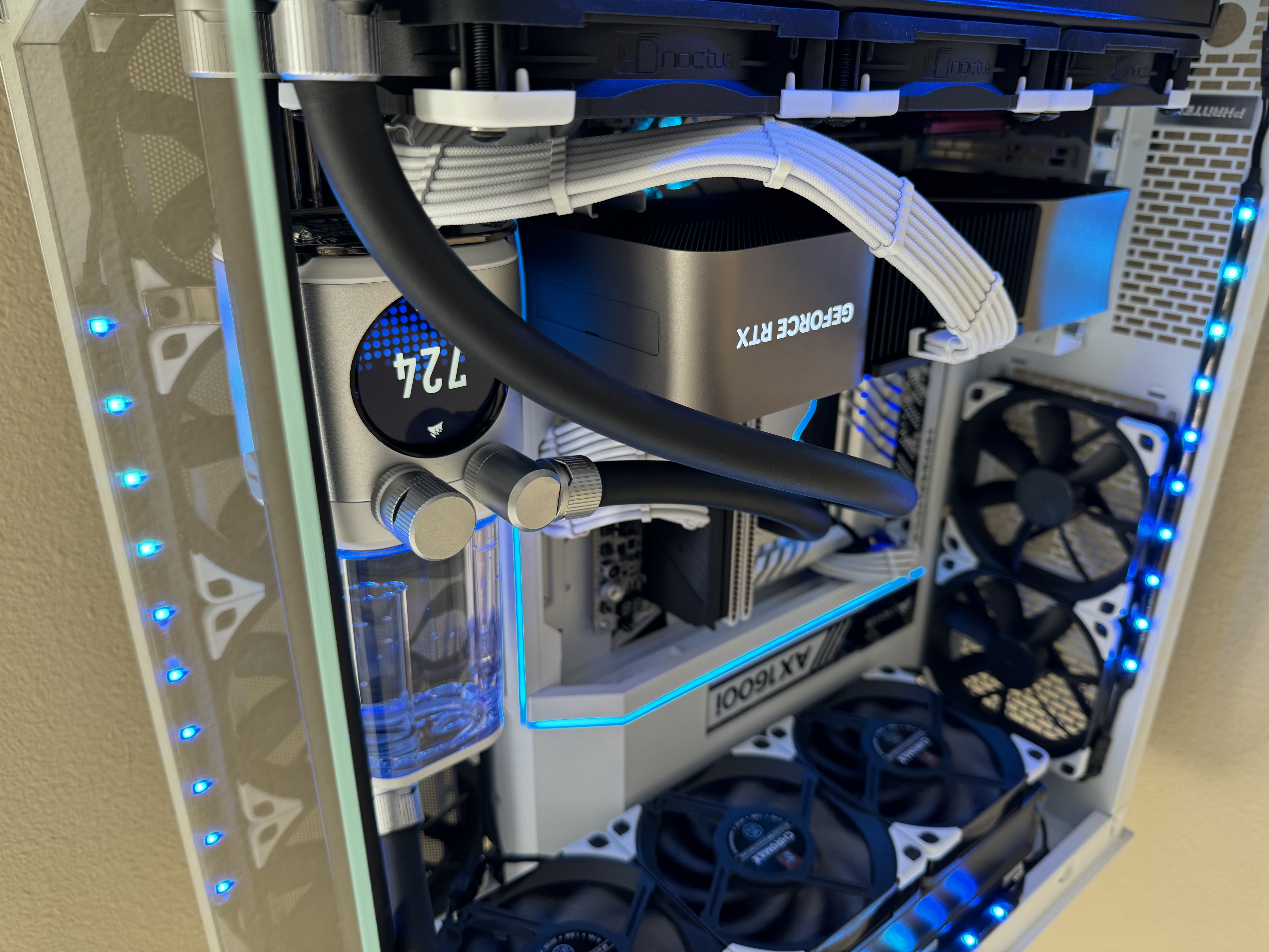 Airflow is handled by a hybrid array of 15 individually controlled fans. Intake is provided by 9 Noctua Chromax NF-A12x25 120mm fans and an additional 6 Noctua Chromax NF-S12A 120mm fans for exhaust. This setup requires the use of two Corsair Commander Core XTs for precise individual fan curve control, pump control and liquid temperature monitoring as well as full RGB control throughout the computer case.