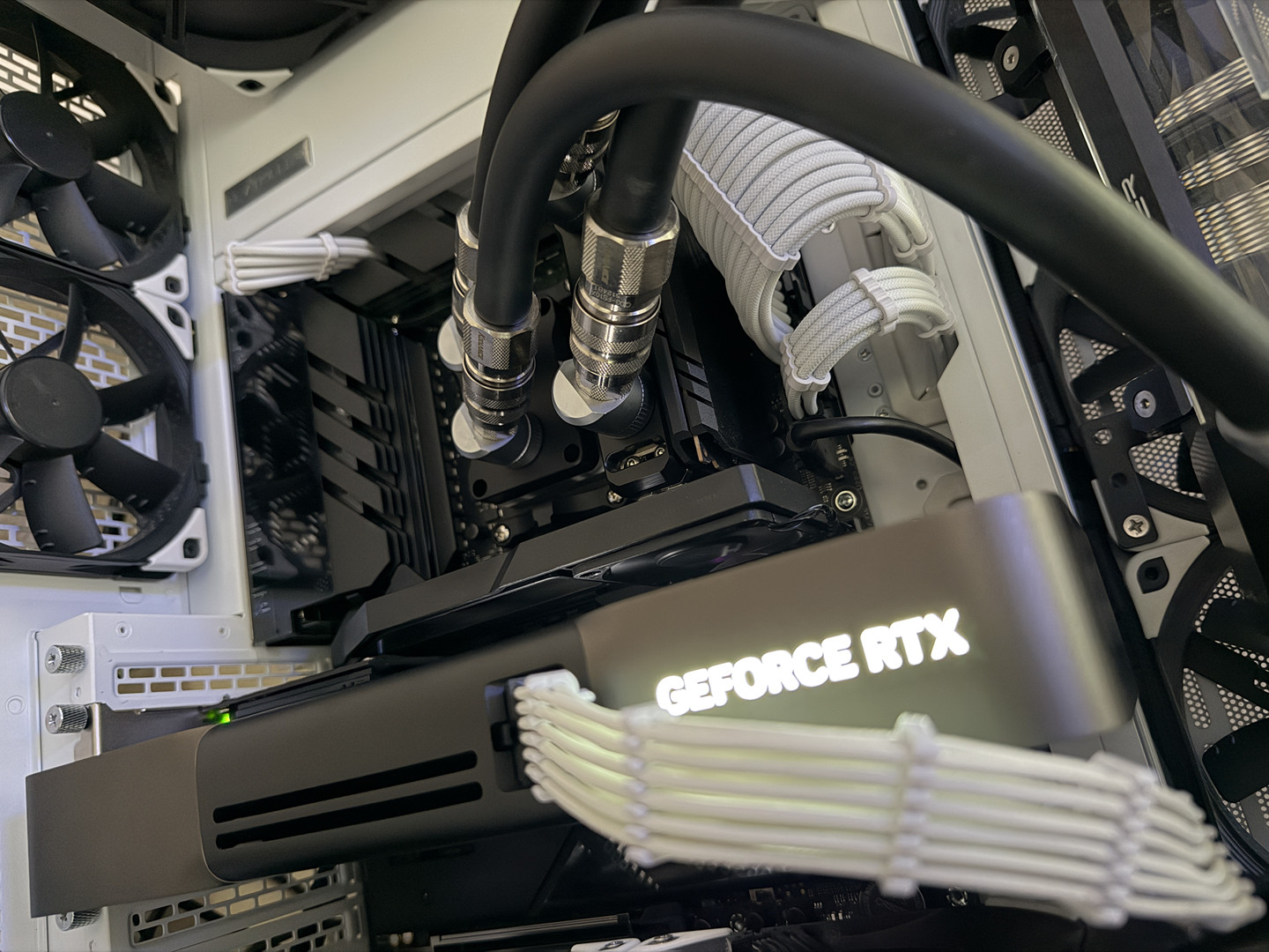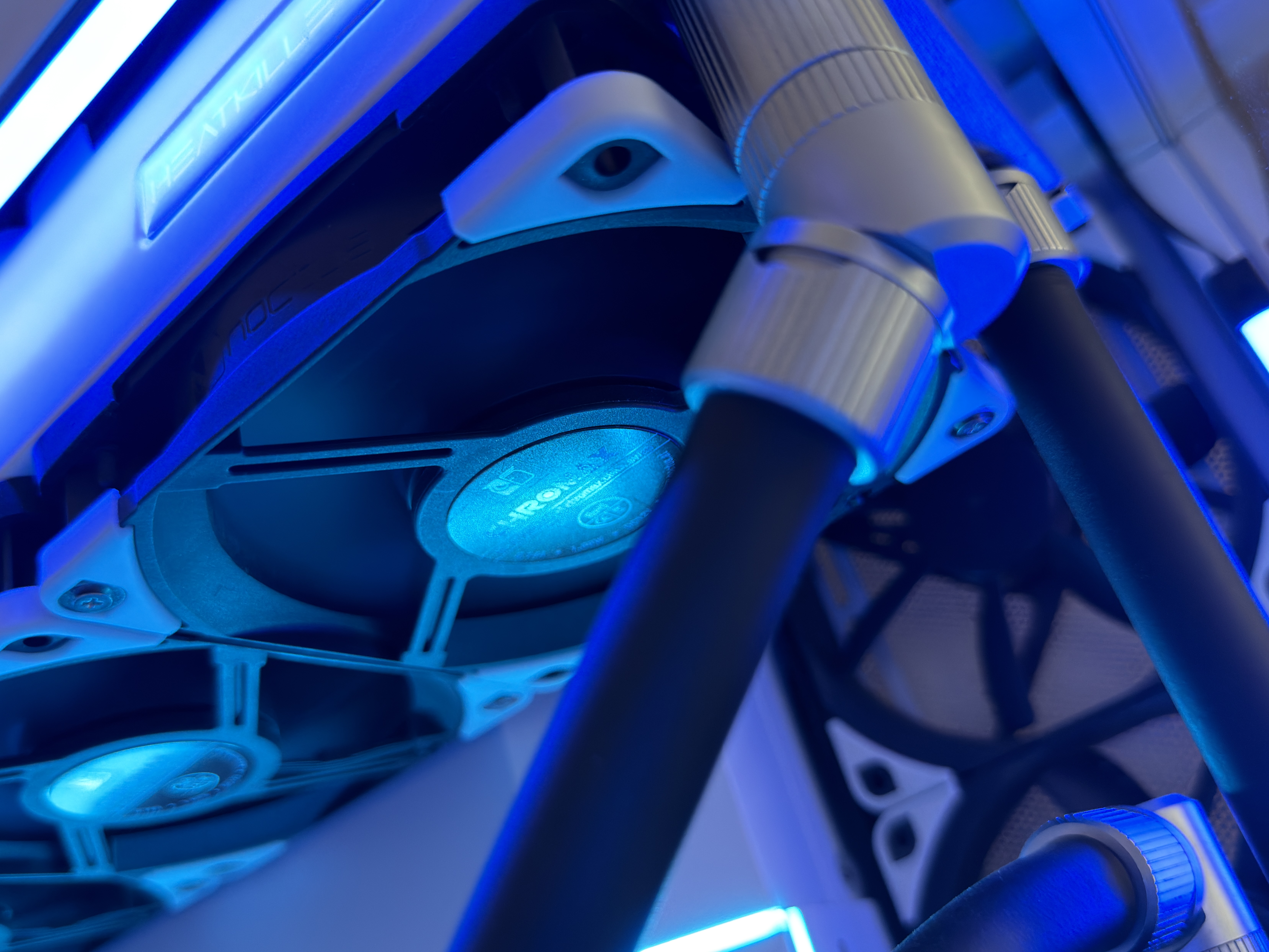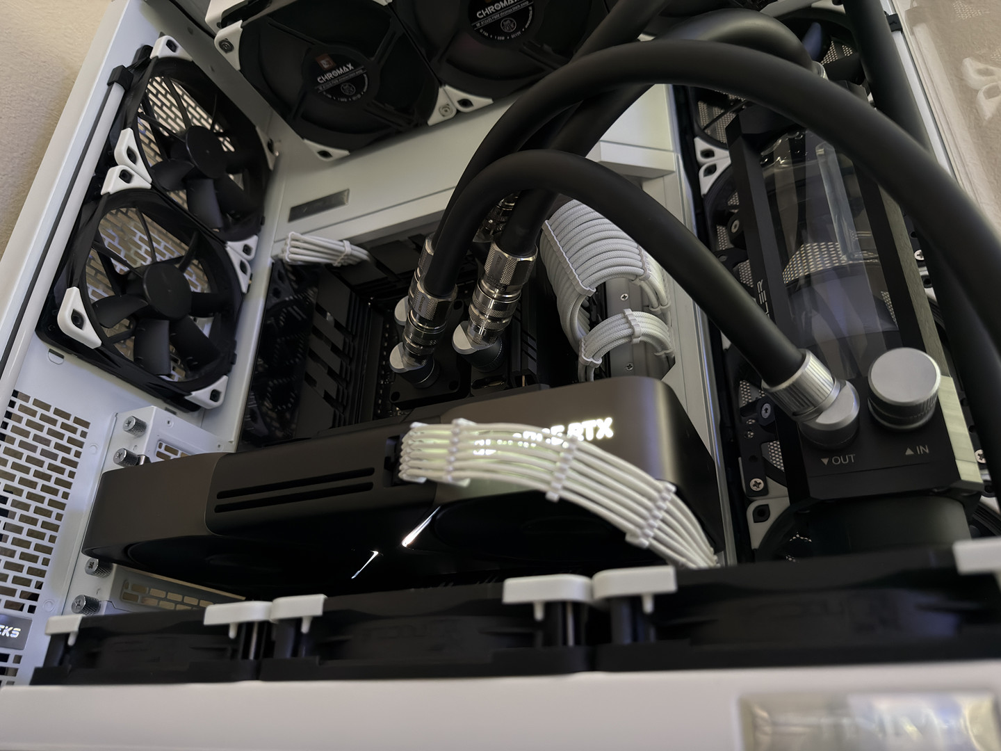 The top 360mm x 55mm Heatkiller RAD 360-L radiator is set to intake cold air directly from outside of the case and is setup in a 6-fan push-pull configuration while bottom 360mm x 35mm Heatkiller RAD 360-S radiator is only setup in a 3-fan push configuration, up through the radiator and into the GPU. After exiting through the back and top of the GPU, the air then meets in the middle of the case and is then exhausted out of either the back of the case or the side of the case.