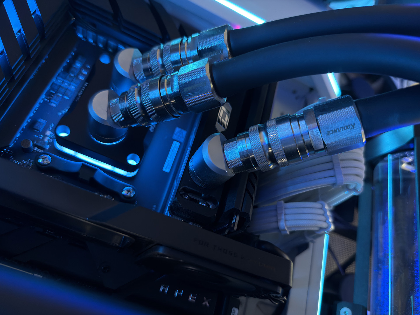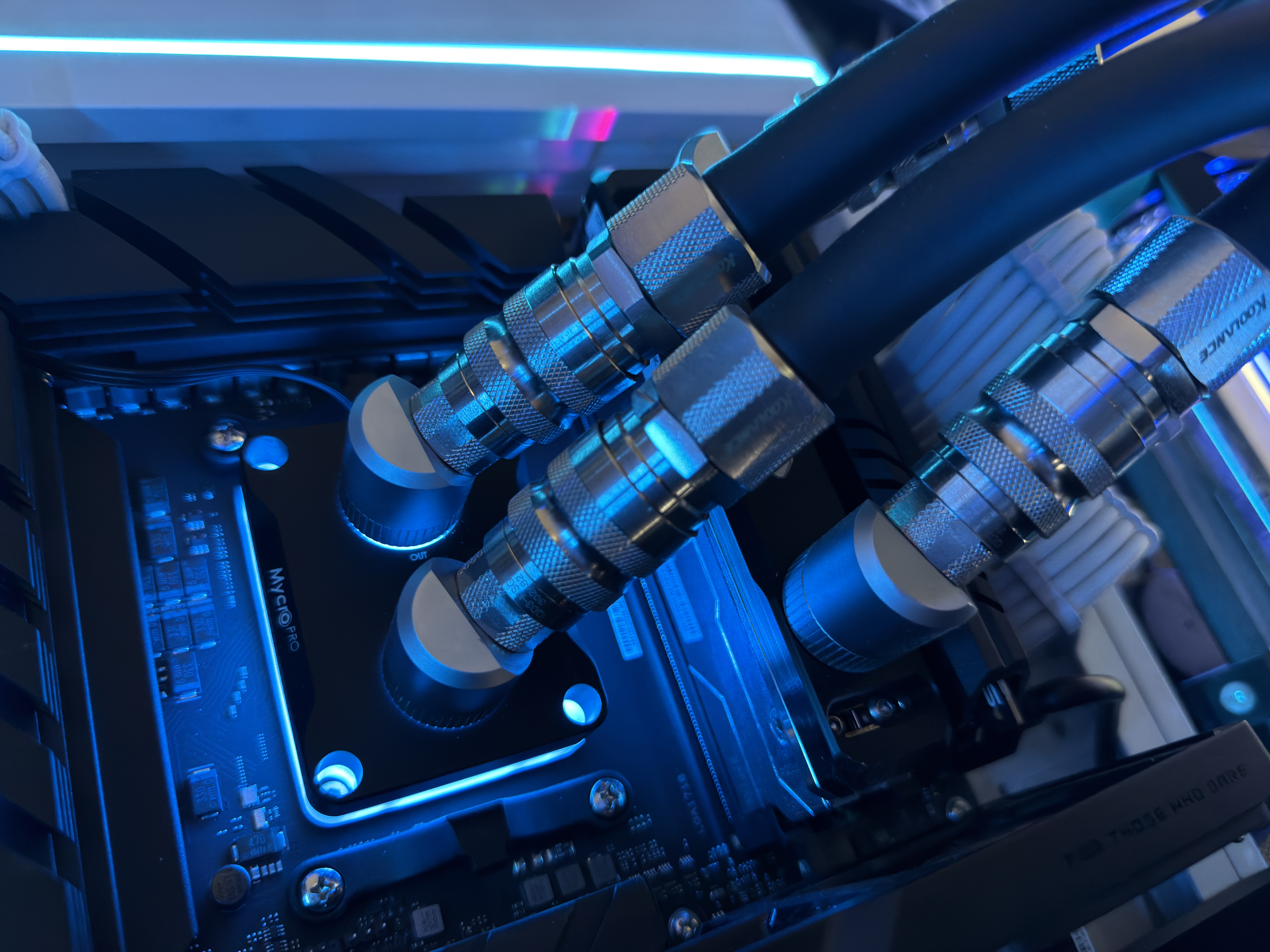 It is paired with an NVIDIA RTX 5090 Founders Edition with an overclock of 2.8GHz and features 64GB of binned G.SKILL Trident Z5 Neo (F5-6000J2636G32GX2-TZ5NRW) memory, each paired with an IceManCooler ICE-RHSG full copper water block allowing for an overclock of 6400MT/s C26 in 1:1 mode @1.65v (24-12-36-30) with completely fine tuned sub-timings and turn around timings for the absolute lowest latency and highest bandwidth at the given clock speed.