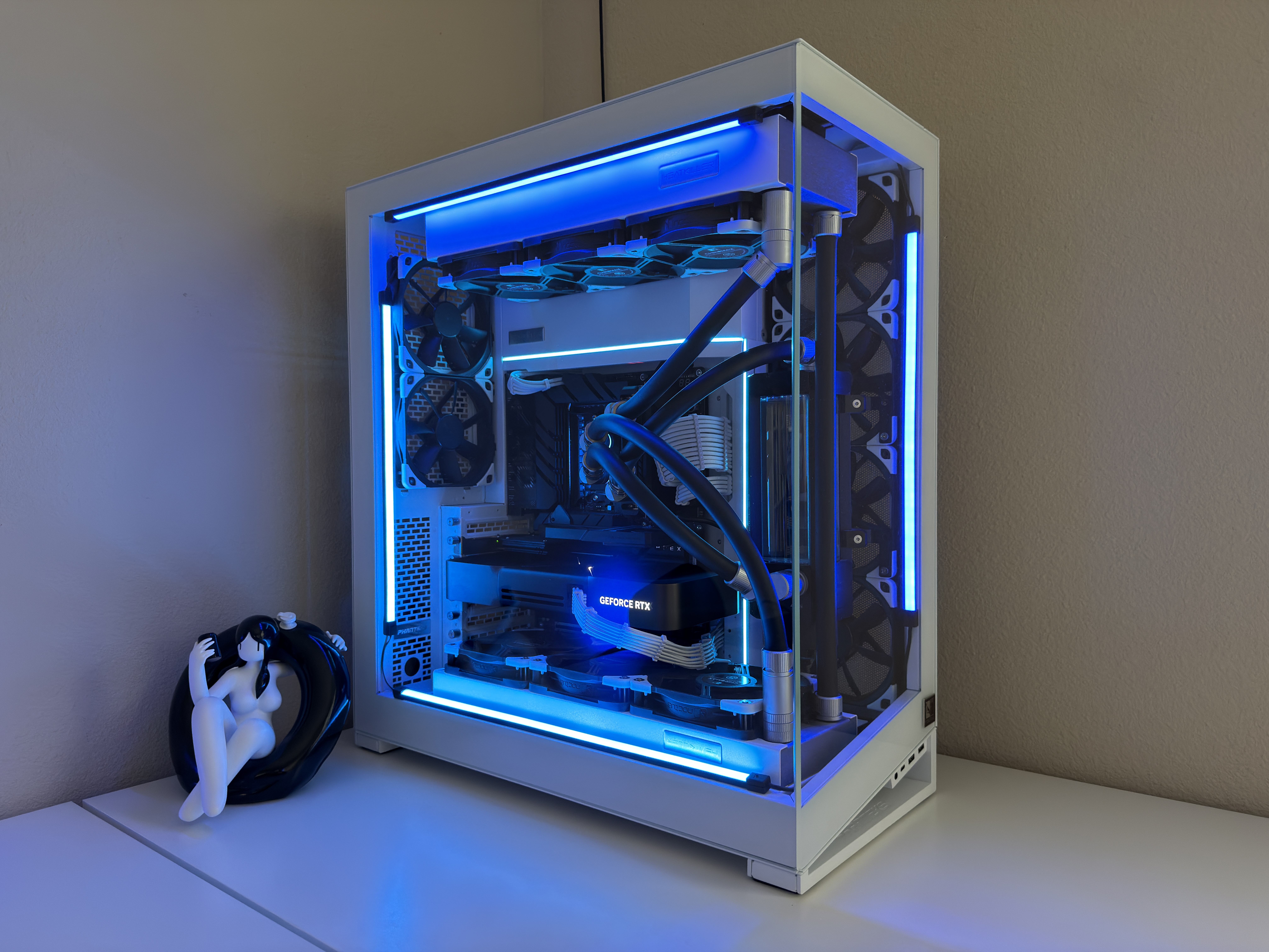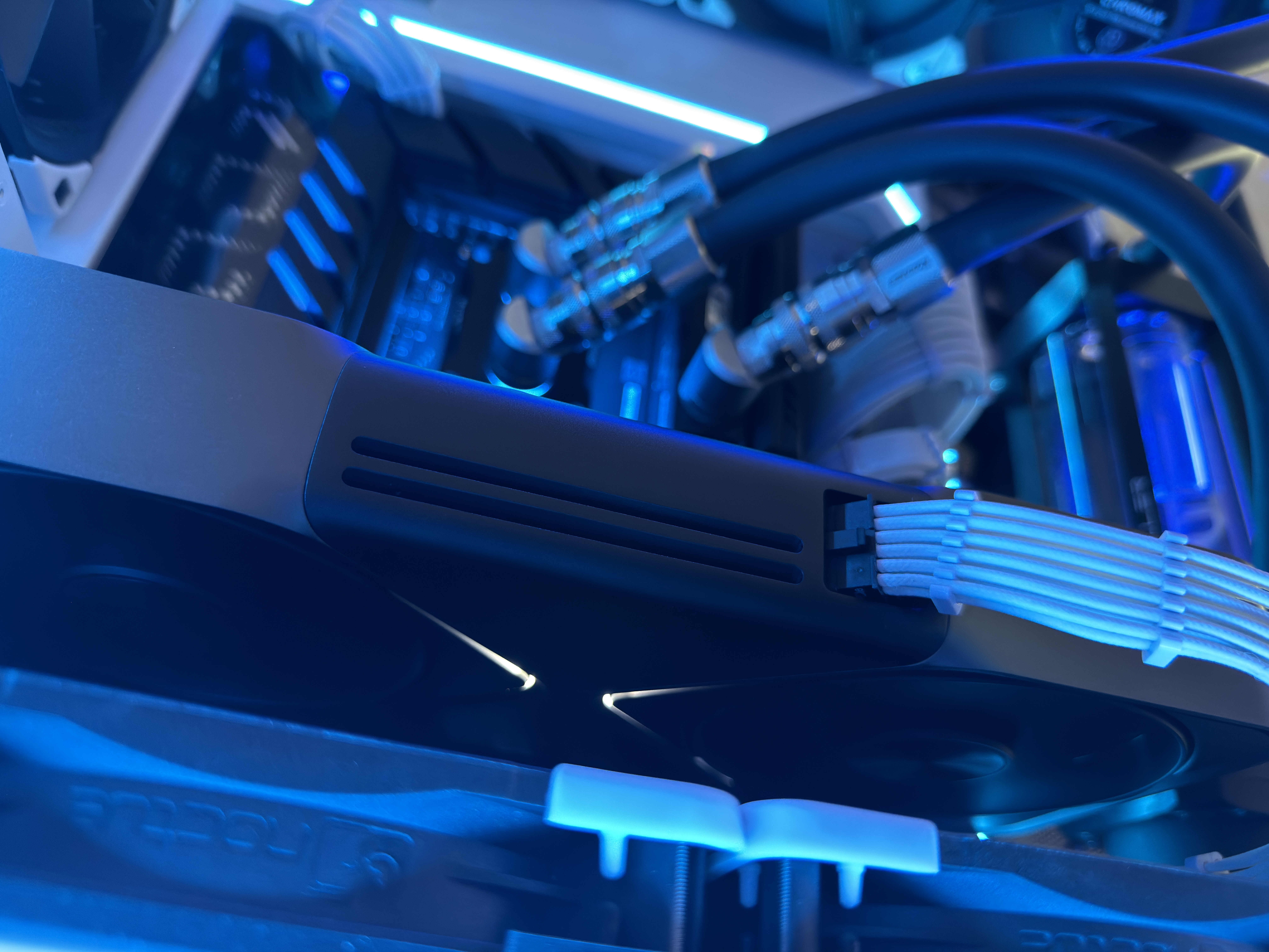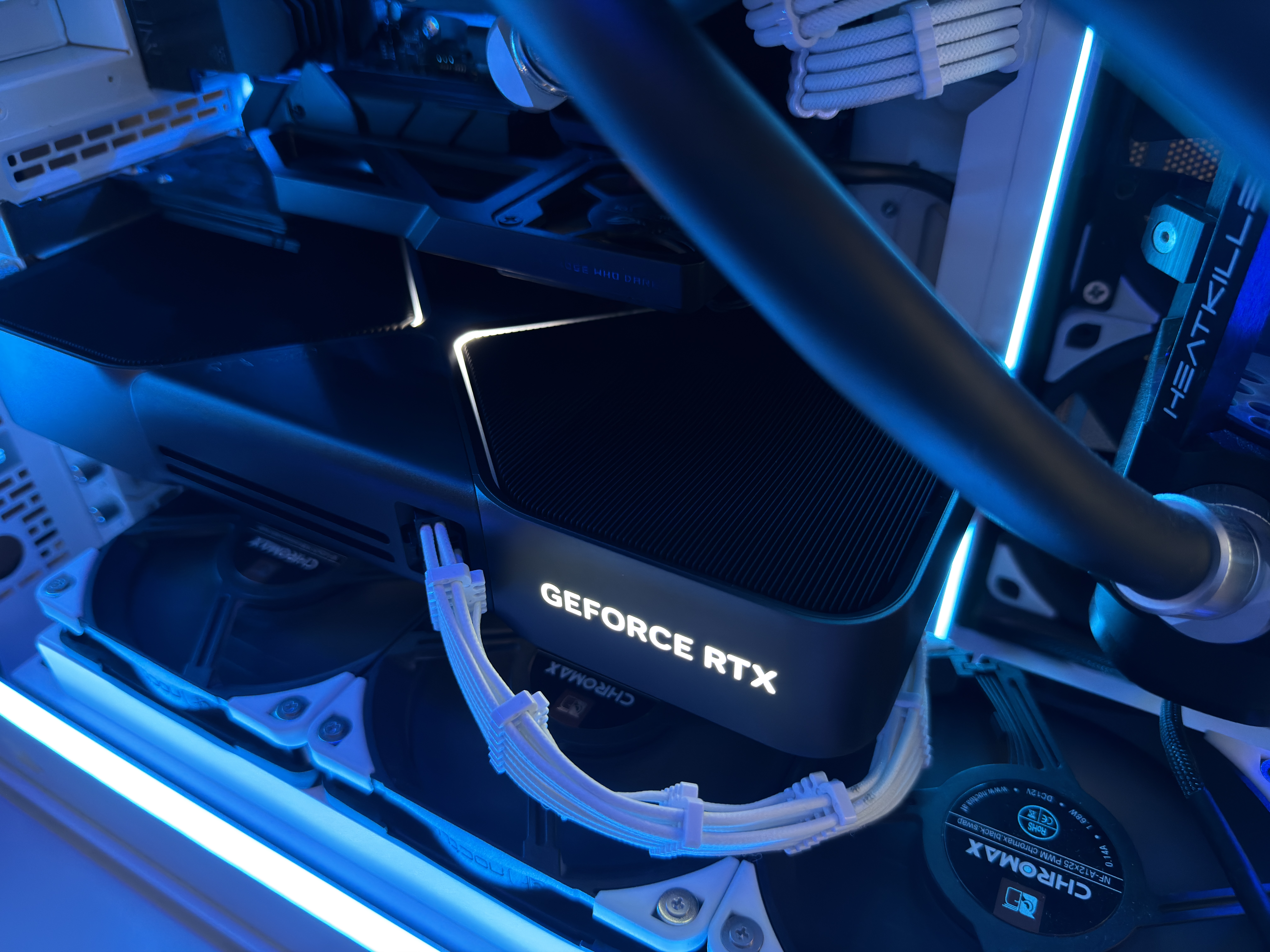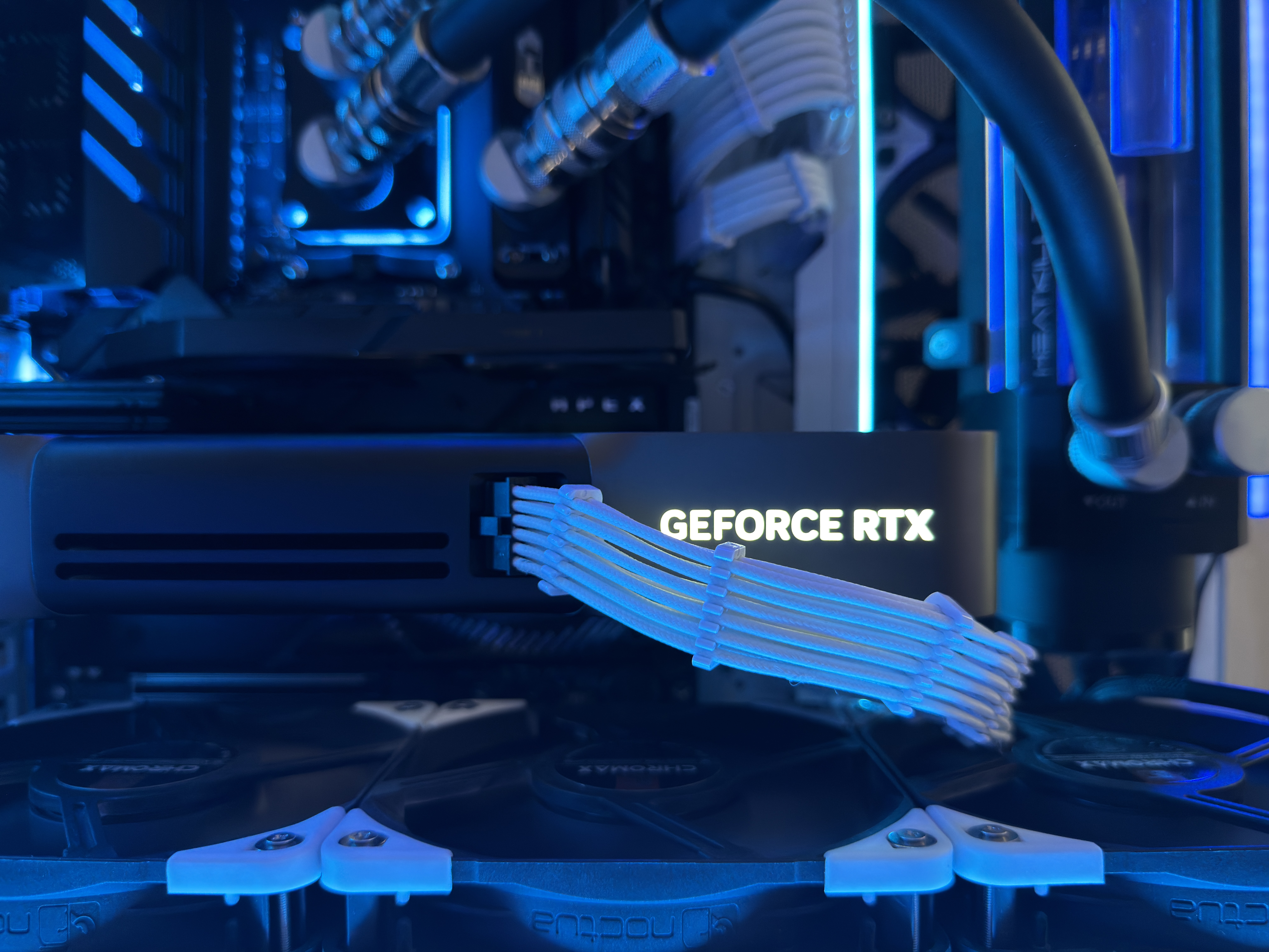 Airflow is handled by a hybrid array of 15 individually controlled fans. Intake is provided by 9 Noctua Chromax NF-A12x25 120mm fans and an additional 6 Noctua Chromax NF-S12A 120mm fans for exhaust. This setup requires the use of two Corsair Commander Core XTs for precise individual fan curve control, pump control and liquid temperature monitoring as well as full RGB control throughout the computer case.