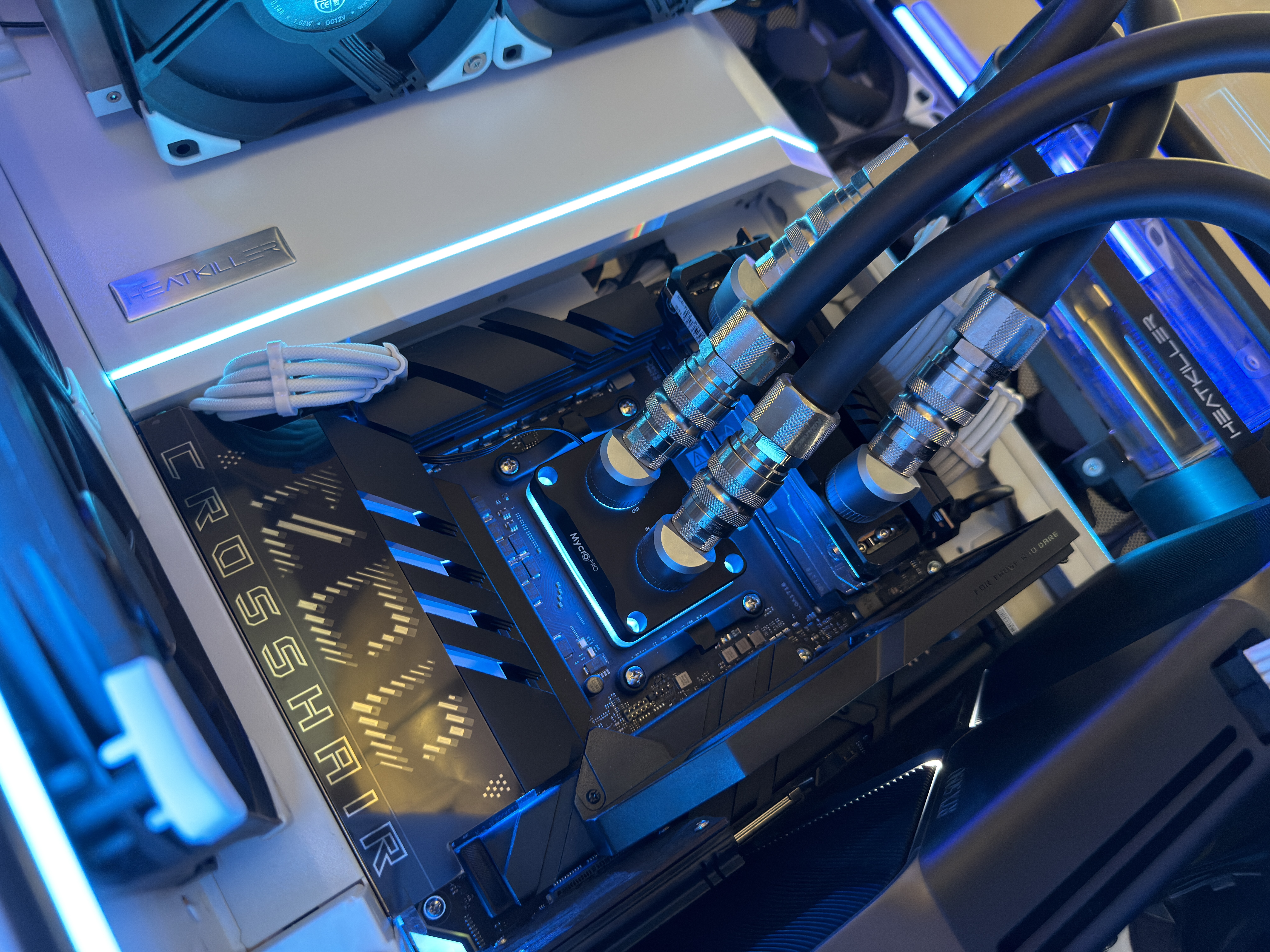 Responsive fan and pump control is crucial when it comes to regulating the amount of heat moved away from the Thermal Grizzly AM5 Mycro Direct-Die water block. Fluid flow is driven by a 375mL Heatkiller Tube 150 D5 MP paired with Heatkiller's WCP D5-PWM pump. It is dynamically controlled by one of the dual Corsair Commander Core XT devices based on the coolant's temperature with a maximum of speed of 4800RPM at 35c liquid.