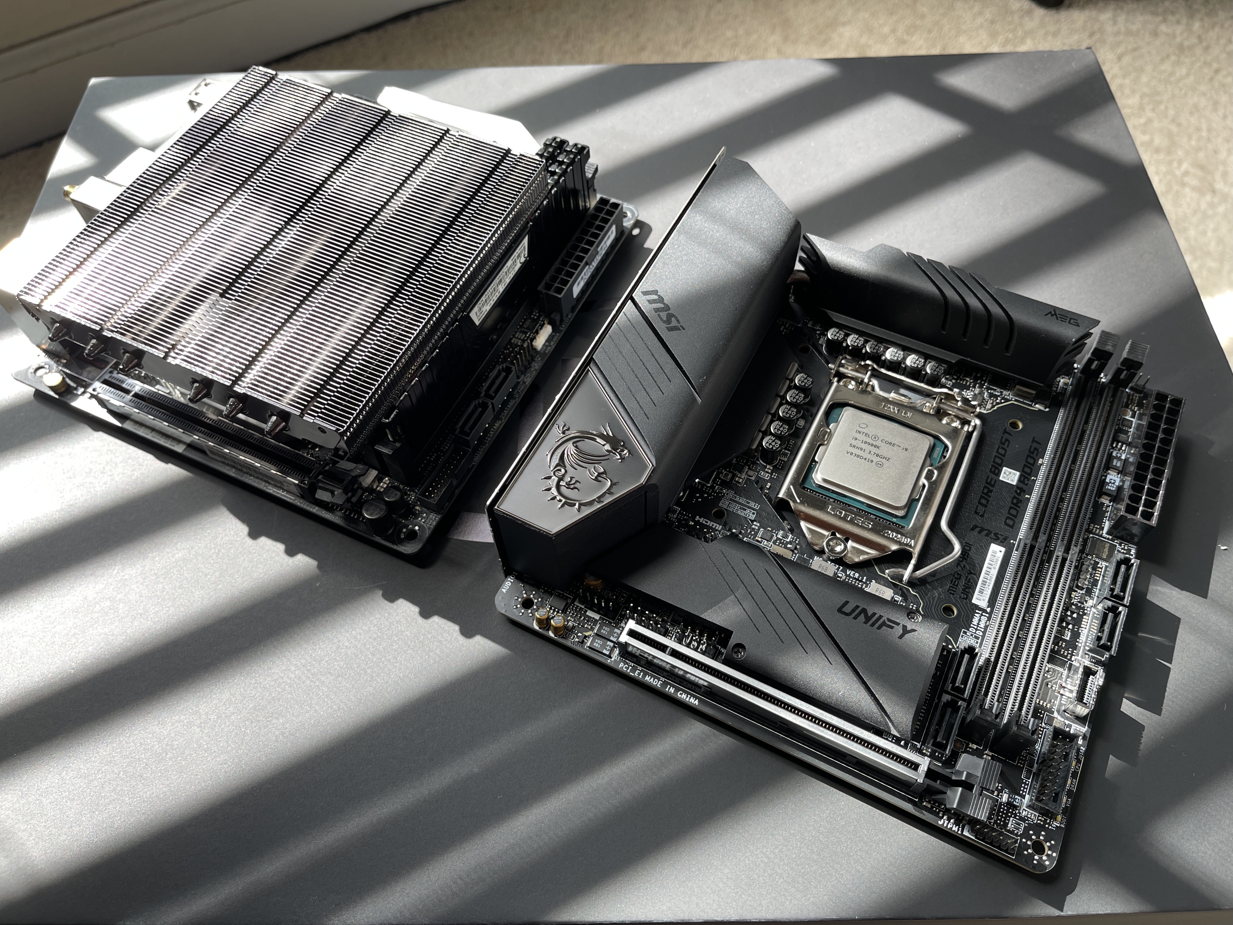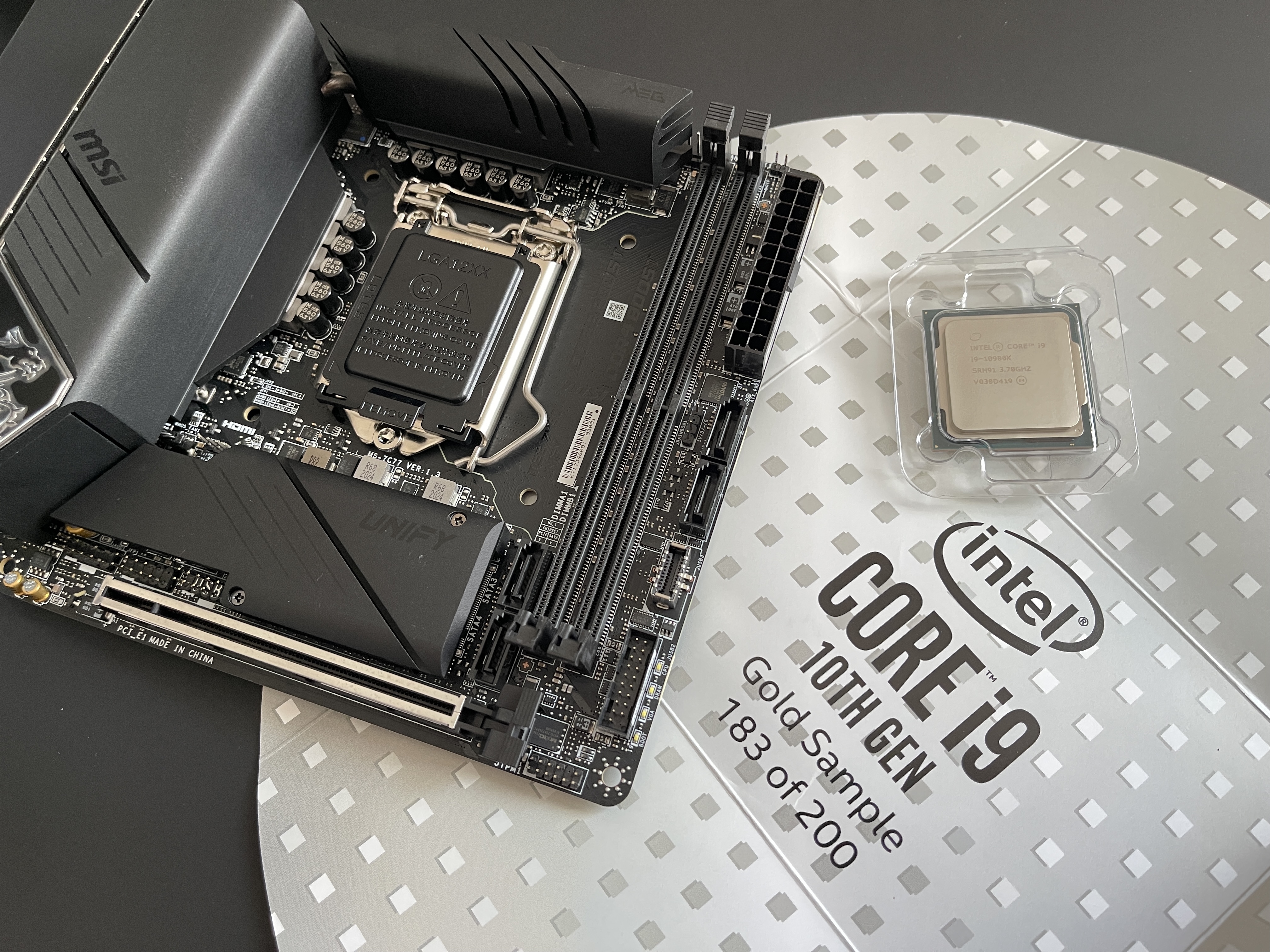 Sunlite is an ITX small form factor computer based on the Intel Z490 chipset and represents the best of Sunway in a high-performance, portable package. It was designed and built on the MSI MEG Z490i UNIFY motherboard for its high CPU overclocking and undervolting potential. It is powered by a highly-binned 10-core, 20 thread Intel Core i9-10900K LTX Golden Sample with an all core overclock of 5.1GHz and a ring ratio of 43. It is paired with an NVIDIA RTX 3080 Founders Edition and features 16GB of Corsair Vengeance DDR4 memory tuned and overclocked to 4266MT/s with a primary timing set of 16-17-17-38.