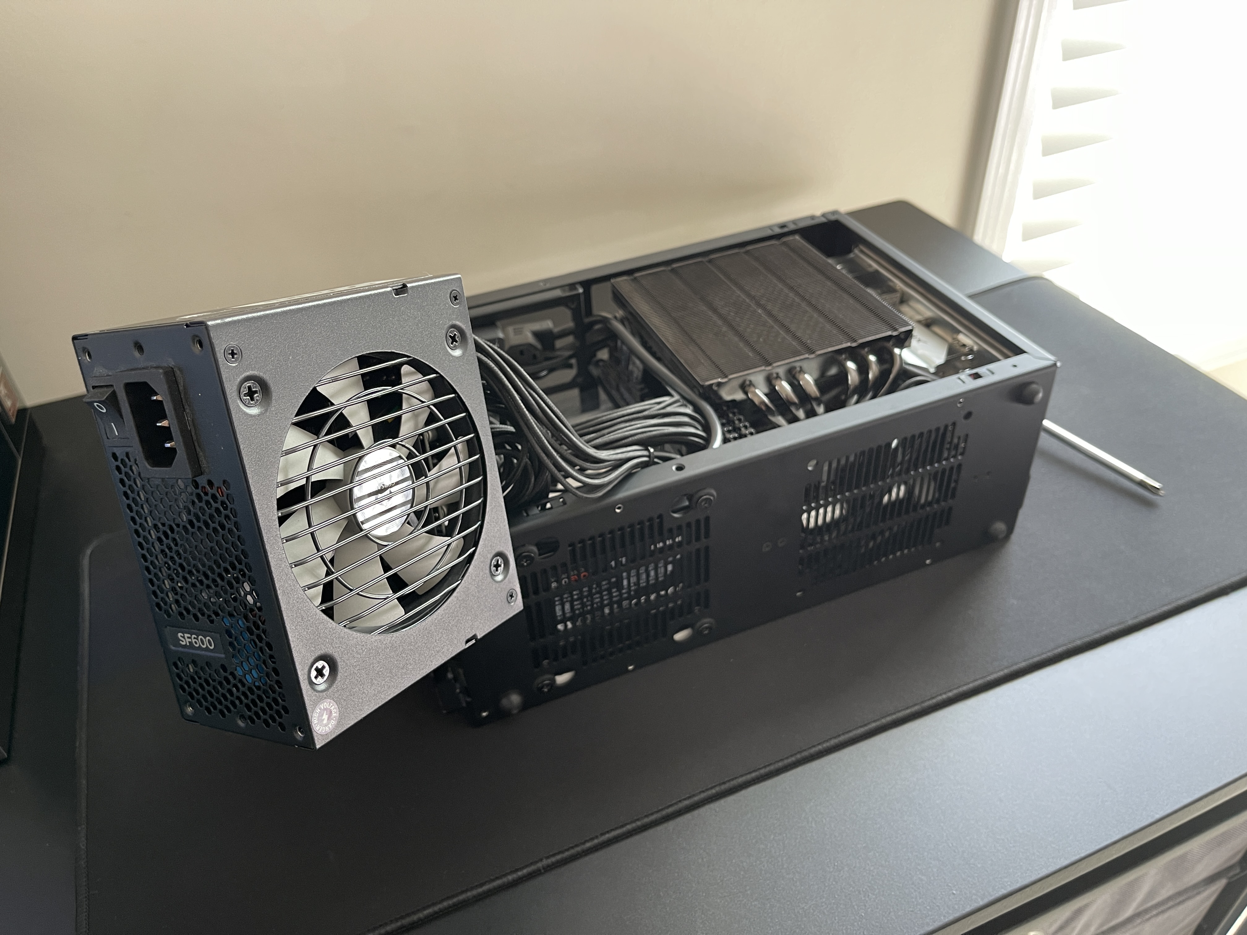Airflow is handled by a Alpenföhn Black Ridge for both the CPU, VRM and memory while the GPU is actively cooled by its dedicated cooling solution. Cold air is taken in directly from the outside of the case on the CPU side an exhausted out of the top of the case. As for the GPU side, cold air is taken in through the GPU's rear fan exhausted out of the back while the front fan takes in air and is then passed through and exhausted by the power supply from the top of the case. With this multi chamber and passthrough setup for various components, this means that the system can achieve a very efficient cooling profile and remains silent at idle, moderate use and slightly audible during heavy gaming.