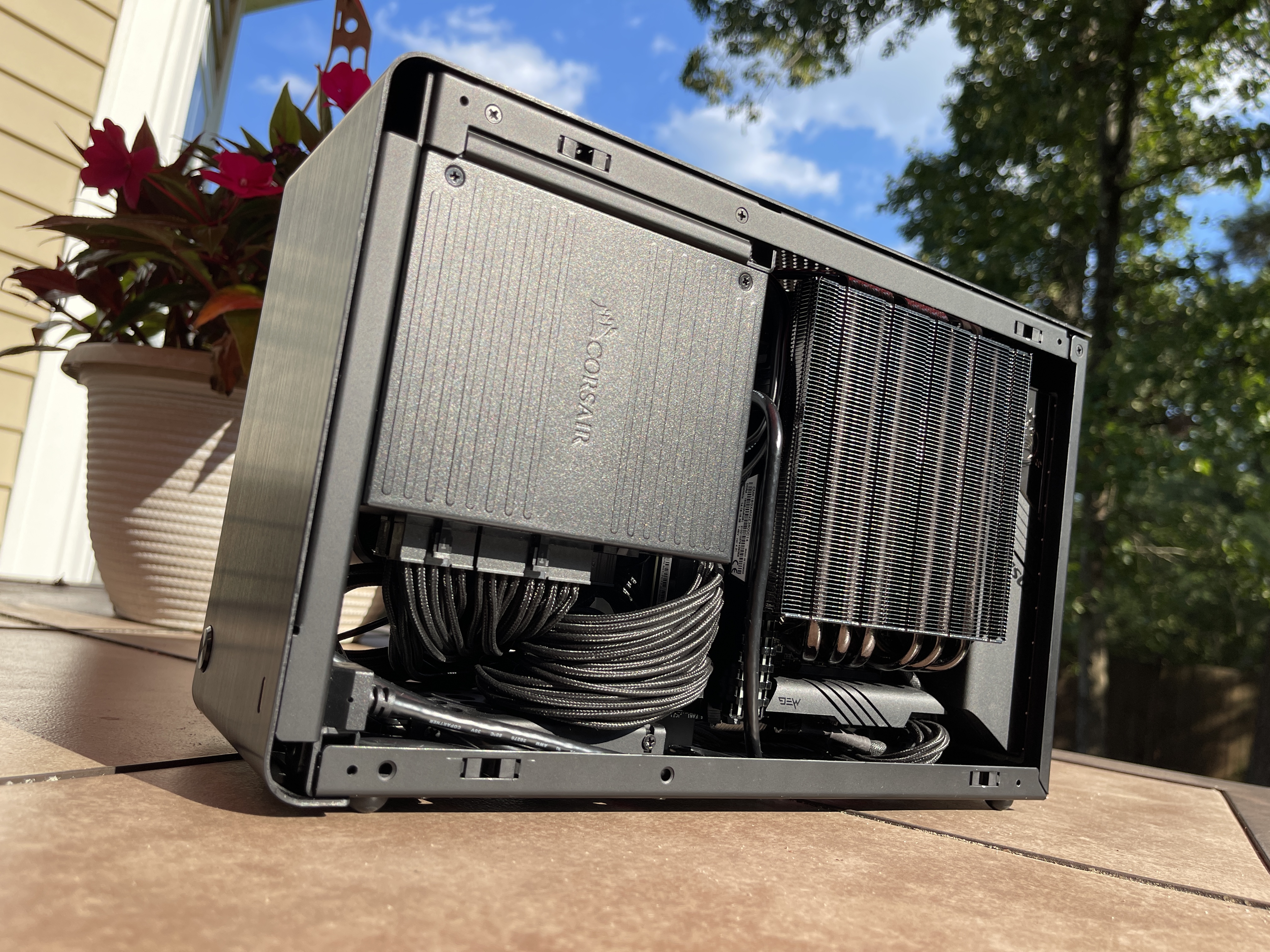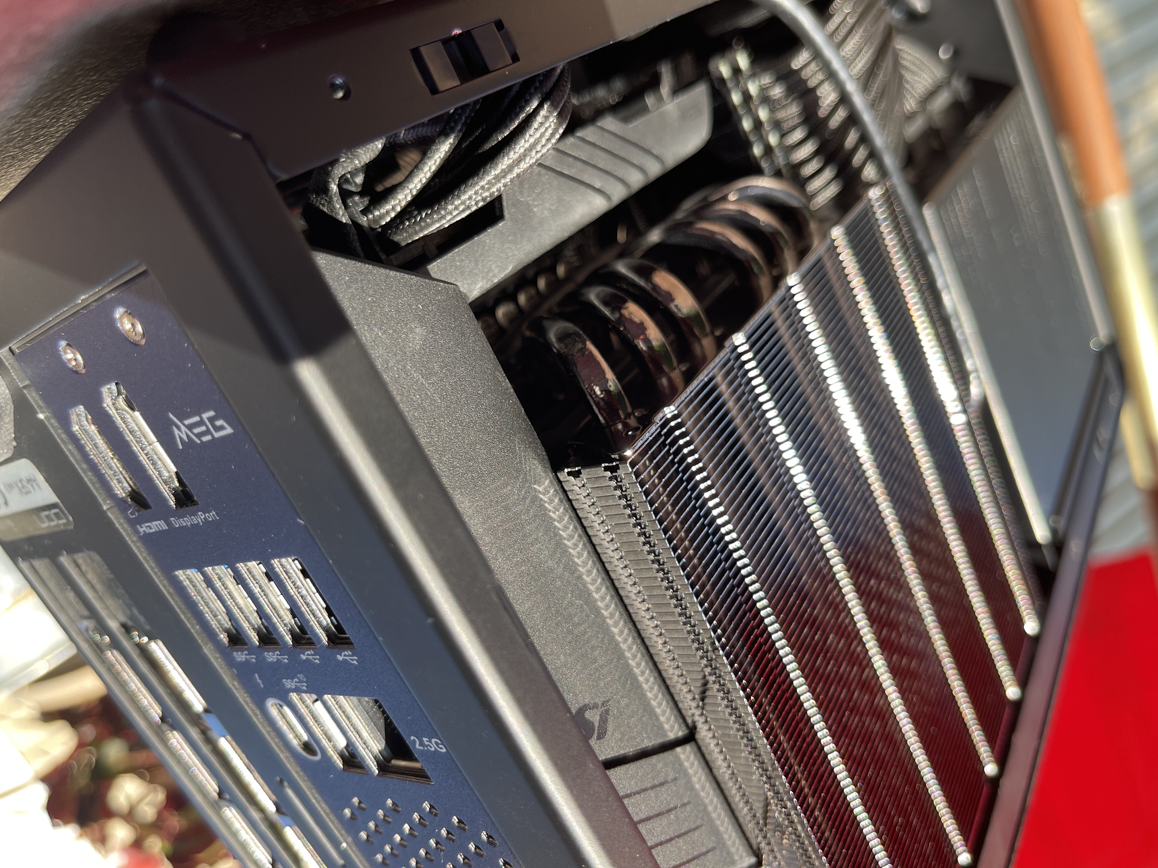 Airflow is handled by a Alpenföhn Black Ridge for both the CPU, VRM and memory while the GPU is actively cooled by its dedicated cooling solution. Cold air is taken in directly from the outside of the case on the CPU side an exhausted out of the top of the case. As for the GPU side, cold air is taken in through the GPU's rear fan exhausted out of the back while the front fan takes in air and is then passed through and exhausted by the power supply from the top of the case. With this multi chamber and passthrough setup for various components, this means that the system can achieve a very efficient cooling profile and remains silent at idle, moderate use and slightly audible during heavy gaming.